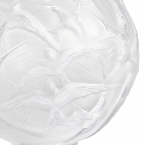 Hirondelles vase made of crystal. A fascinating work of art, the Hirondelles vase embodies the strength and grace of the swallow, an animal that particularly inspired the Master René Lalique. The design and workmanship of the vase celebrate the swallow as a messenger of spring, a symbol of happiness and freedom. Made of satin-finished and re-polished crystal, the swallows are juxtaposed in a vibrant game of graphic repetition. Made by Lalique.