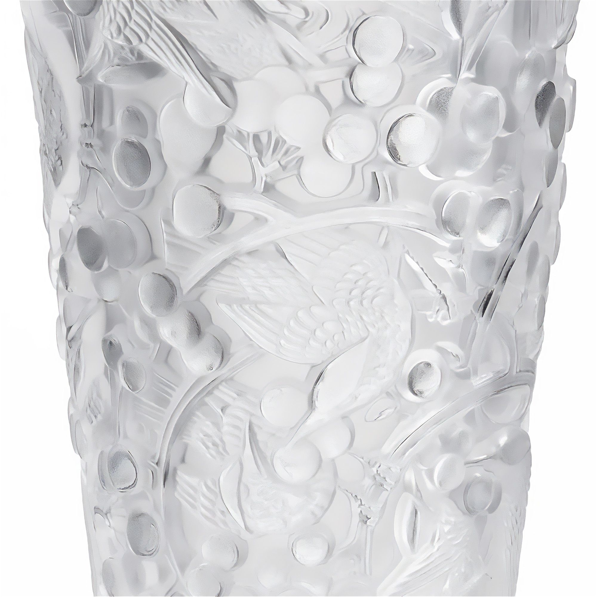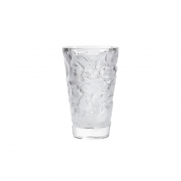 Merles Et Raisins medium vase in the "Clear" finish made of crystal. Attention to the smallest details, the Merles Et Raisins vase is a tribute to René Lalique's historic creation from 1928, which adorned the inlays of the legendary Orient Express. Now reinterpreted by Studio Lalique, the vase lives again in contemporary shapes and includes different sizes and colours. This crystal piece steeped in history and culture is a timeless treasure for lovers of elegance and sophisticated design. Made by Lalique.