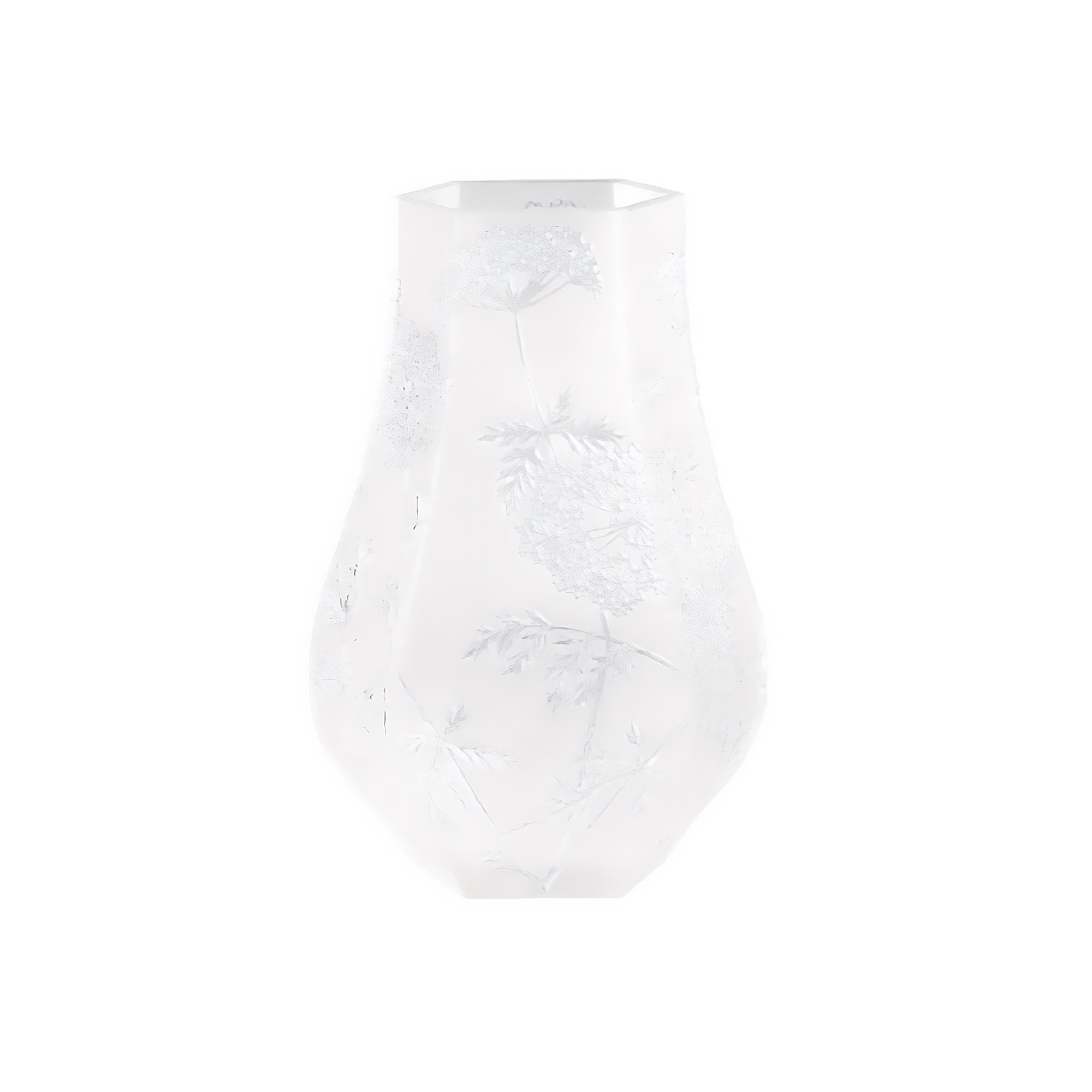 With the Ombelles vase, Lalique has managed to combine lightness, evanescence and modernity to create a piece that is as airy as it is rooted in traditional craftsmanship. The charm of this vase is expressed by the thin lines of flowers that emerge from the crystal, evoking a sense of delicate flowering and lightness. The purity of the crystal is enhanced by the sobriety of the design. The result is a perfect symbiosis between material and form, in which crystal is not just a medium but an integral part of the artistic story. Lalique's skill in manipulating crystal shines through in the brightness of the vase, where the transparent bloom seems to dance, cradled by the wind. The points of light that spread along the surface of the vase add an additional level of detail, bringing the vase to life and making each stem and corolla shine. Available in two fascinating color finishes, the Ombelles vase is a piece that captures a moment of ephemeral beauty and eternalizes it in crystal. The Ombelles vase fits perfectly into both contemporary and traditional settings, elevating them with its understated yet noticeable presence.