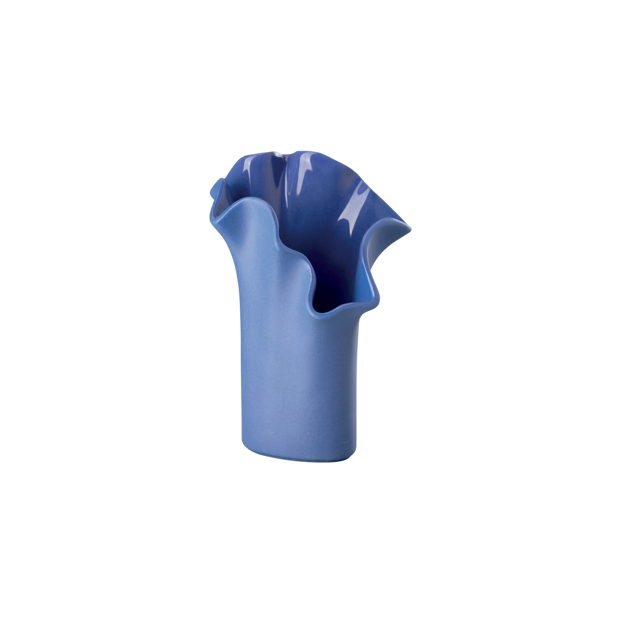 Asym Midnight vase (Height 9 cm) crafted in colored porcelain. Part of the Mini Vases+ Collection, the Asym Midnight vase emerges as a gem of contemporary design. With its compact size, this vase embodies modern elegance and the capability to capture attention through its deep Midnight color and distinctive asymmetric shape, perfectly capturing the essence of the night. The rich and intense Midnight color evokes the night sky and adds visual depth, while the vase's asymmetric shape offers a dynamic and innovative visual angle. Ideal for those seeking a design object that is both modern and meaningful, the Asym Midnight vase is versatile: perfect for being placed as a unique piece or in combination with other vases from the collection to create a harmonious and impactful ensemble. The asymmetry of the design is not merely a stylistic choice but also a symbol of breaking with convention, suggesting a new direction in the art of decoration and interior design. Made by Rosenthal.