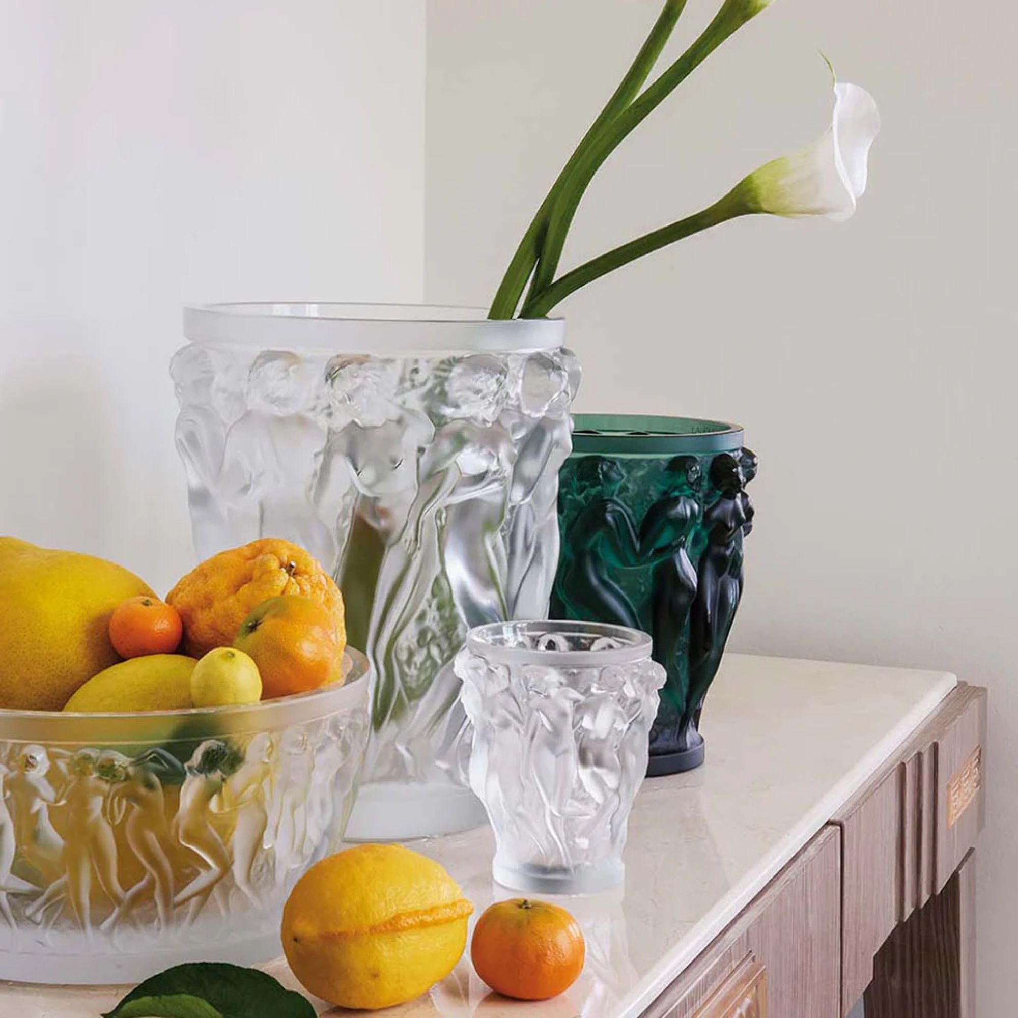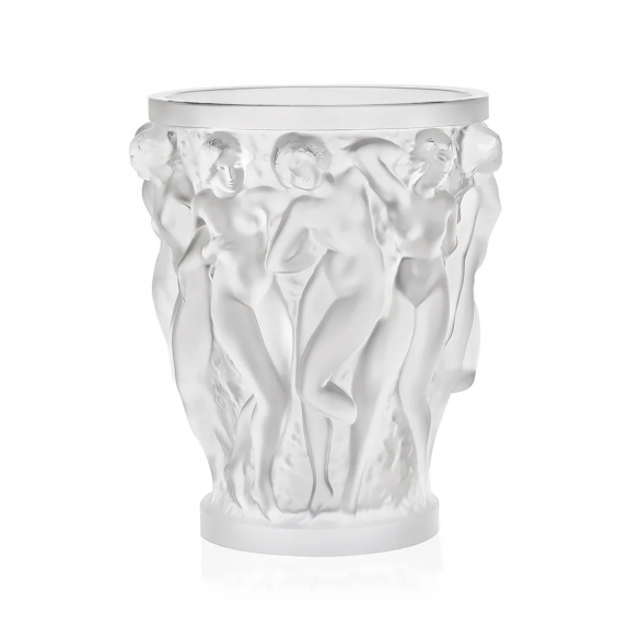 In 1927, the imagination and creative genius of René Lalique birthed the Bacchantes XXL vase, a marvelous decorative object made of clear crystal. The iconic design depicts the young priestesses of Bacchus with their beauty and voluptuous curves. Thanks to its design and transparency, the vase matches any setting and decor style: whether used as a container for flowers in the living room, in the office, or simply as a decorative accessory in the bedroom, Bacchantes XXL is a vibrant ode to nature and femininity. This vase is not just a container, but a work of art that draws attention and sparks conversations, a coveted item by collectors and an elegant focal point for any interior.
