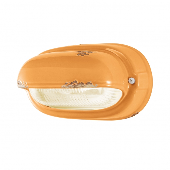 C291 wall lamp made of ceramic with transparent glass diffuser and aluminum frame. Perfect for illuminating a corridor, a living room or an entrance, the C291 wall lamp is a retro-style applique available in different colors and captivates at first glance for its peculiar finish that recalls a worn but skilfully handcrafted object. Light source 1x46W E27 - IP20. Designed and manufactured by Ferroluce.