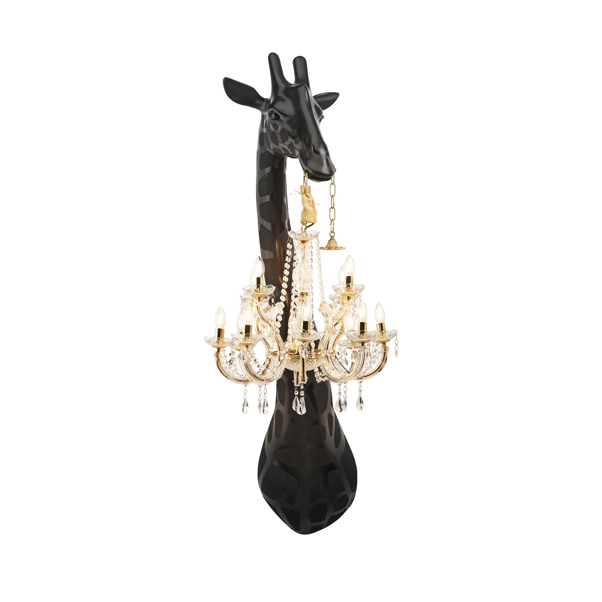 The Giraffe In Love wall lamp is a 1.73 m tall giraffe holding a Marie-Thérèse style chandelier, made by Qeeboo using recyclable polyethylene, polycarbonate, and glass—high-quality materials that ensure durability, longevity, and flexibility. This stunning wall lamp is available in two beautiful colors and, thanks to its extremely elegant design, can harmoniously integrate into any setting and style of decor. Whether positioned in a minimalist design living room or in a contemporary and modern bedroom, the Giraffe In Love floor lamp will capture the attention of your guests and become the undisputed star of your conversations. Additionally, this lamp shines with its unique aesthetics and is also energy efficient. The Giraffe In Love wall lamp will become a versatile and playful design object that takes the stress out of your days. Designed by Marcantonio Malerba for Qeeboo.