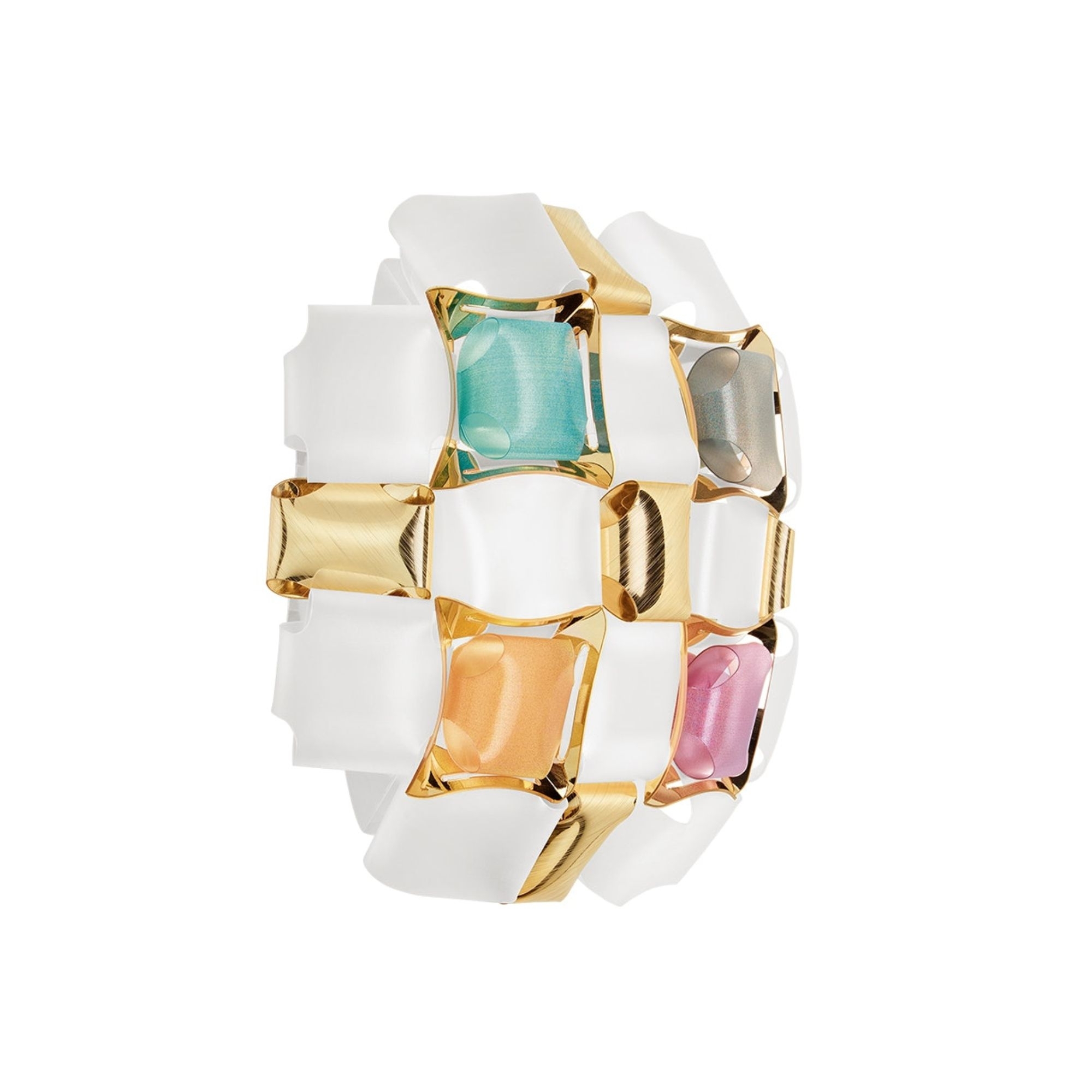 The Mida Applique wall lamp is a delightful work of art with a precious and versatile design crafted by Slamp in Lentiflex®, Opalflex®, and Cristalflex®, innovative technopolymers that ensure brilliance, lightness, and durability. Available in five different colors, the Mida applique version has a diameter of 32 cm and perfectly matches any type of context and setting: whether installed individually or in more complex compositions in a living room, office, or luxurious waiting rooms, Mida always manages to create a warm and welcoming atmosphere. Its gems, with a silky and iridescent finish, are set on an almost invisible frame and are handmade. Moreover, the Mida Applique wall lamp is equipped with a magnetic attachment, for easy cleaning and installation. Designed by Adriano Rachele for Slamp.