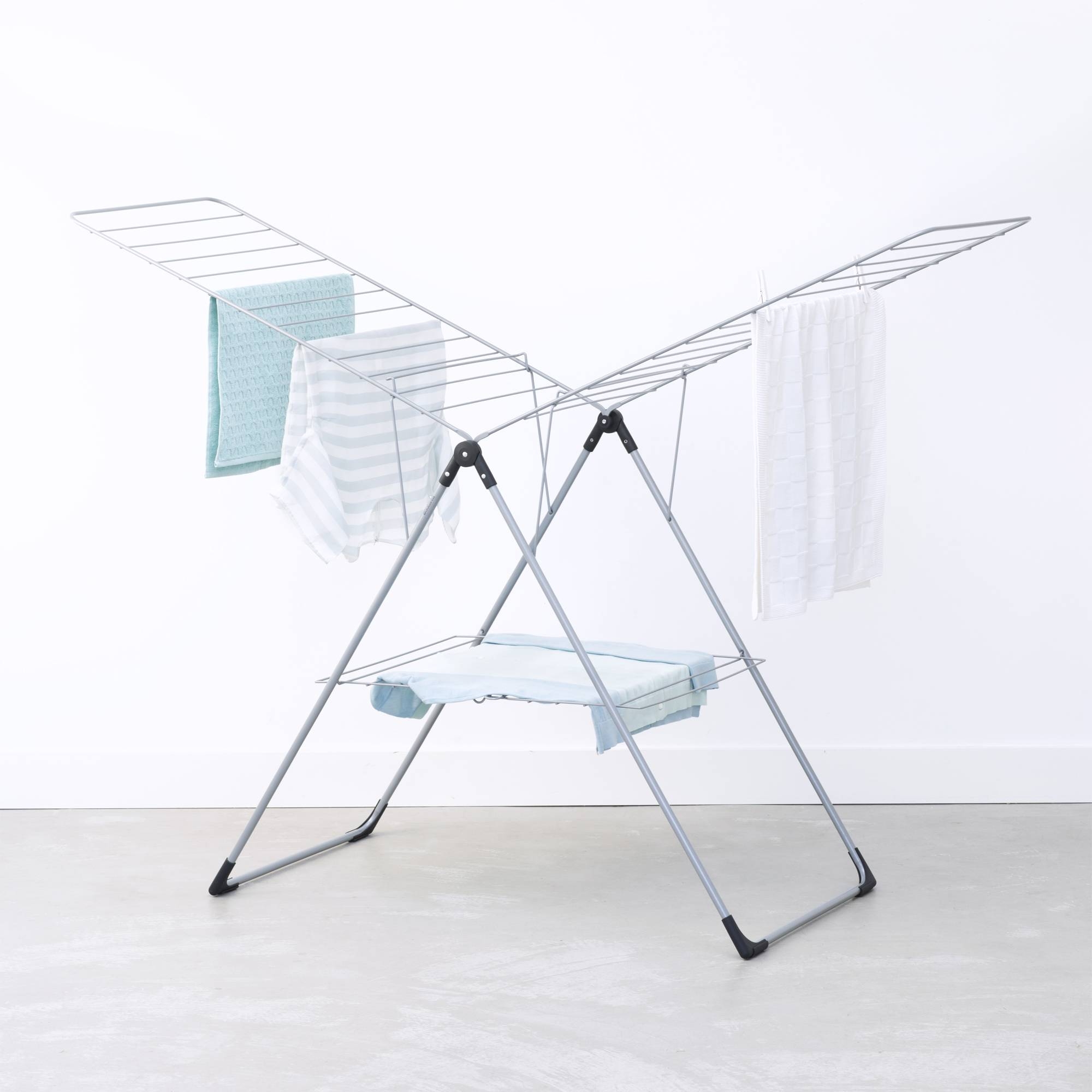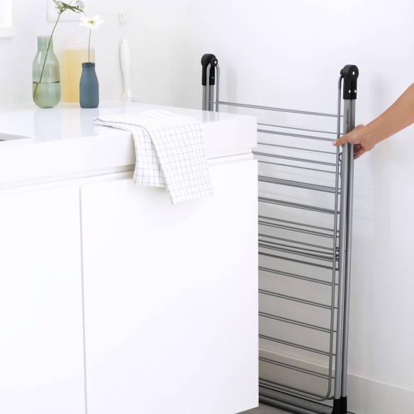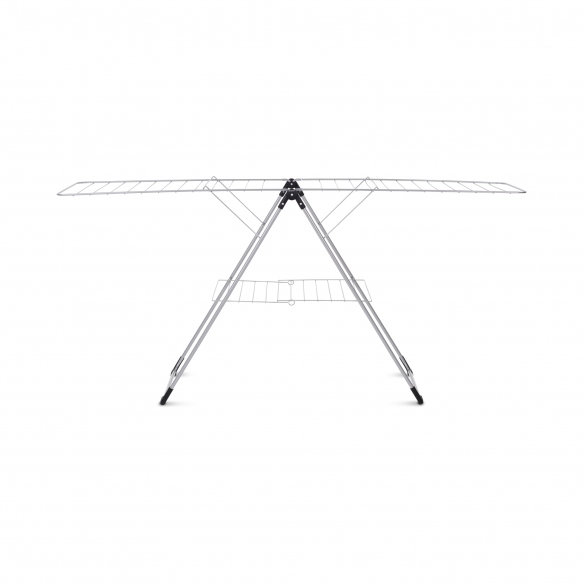 Stendibiancheria Modello a T da 20 metri, realizzato in acciaio. Disponibile in 2 finiture di colore, lo stendibiancheria Modello a T è l'oggetto ideale per chi ha bisogno di spazio e praticità. Con i suoi 20 metri di filo, può ospitare fino a due carichi di biancheria, compresi i pantaloni, grazie alle ali regolabili in altezza. Ha anche un ripiano inferiore per asciugare i capi delicati in piano, rispettando l’ambiente e il tuo portafoglio. Lo stendibiancheria Modello a T è facile da spostare e da riporre, grazie al blocco per il trasporto e al design pieghevole. Ha una garanzia di 5 anni e una certificazione Cradle-to-Cradle a livello bronzo. Realizzato da Brabantia.