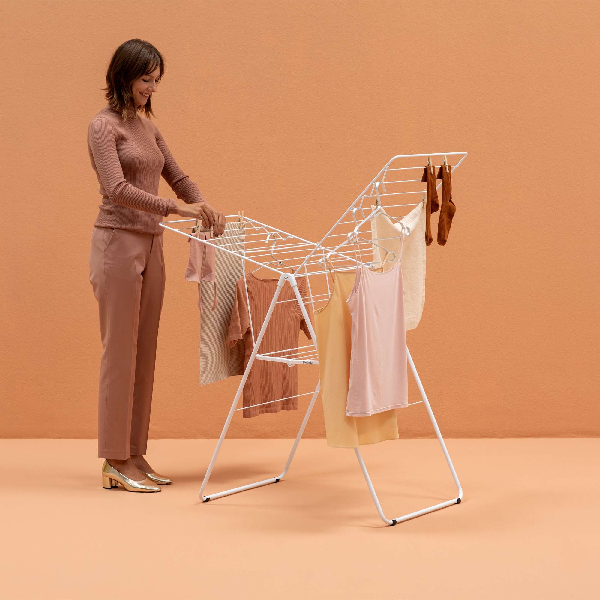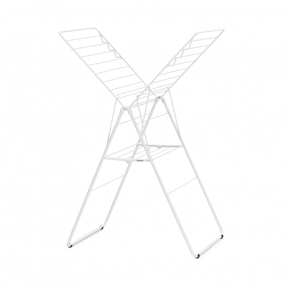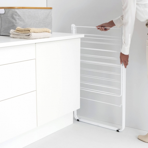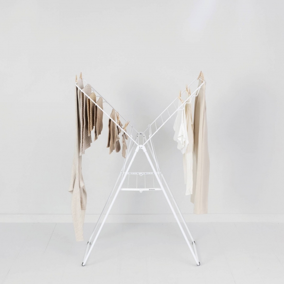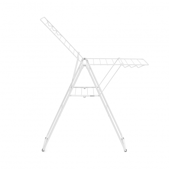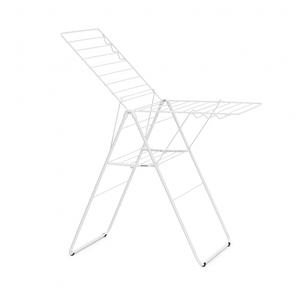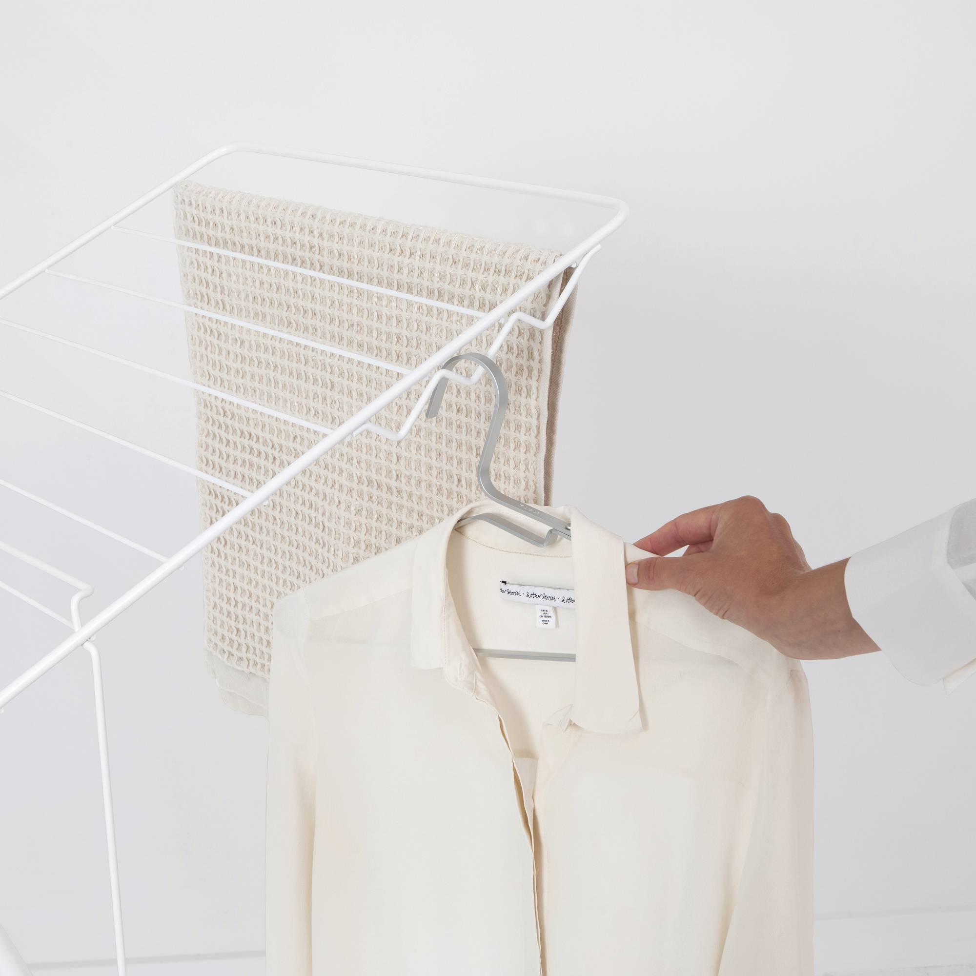 Stendibiancheria della collezione HangOn, dalla lunghezza di 20 metri, realizzato in metallo resistente. Disponibile in 3 finiture di colore, HangOn è un accessorio immancabile nella tua casa: è leggero, pratico, compatto e sfrutta lo spazio in modo intelligente! Può accogliere fino a 3 carichi di bucato e l'altezza delle ali è regolabile! Le dimensioni rimangono contenute, sia una volta ripiegato sia quando chiuso. I piedini di protezione robusti evitano di rovinare il pavimento e garantiscono grande stabilità. Lo stendino per eccellenza! Progettato e realizzato da Brabantia.