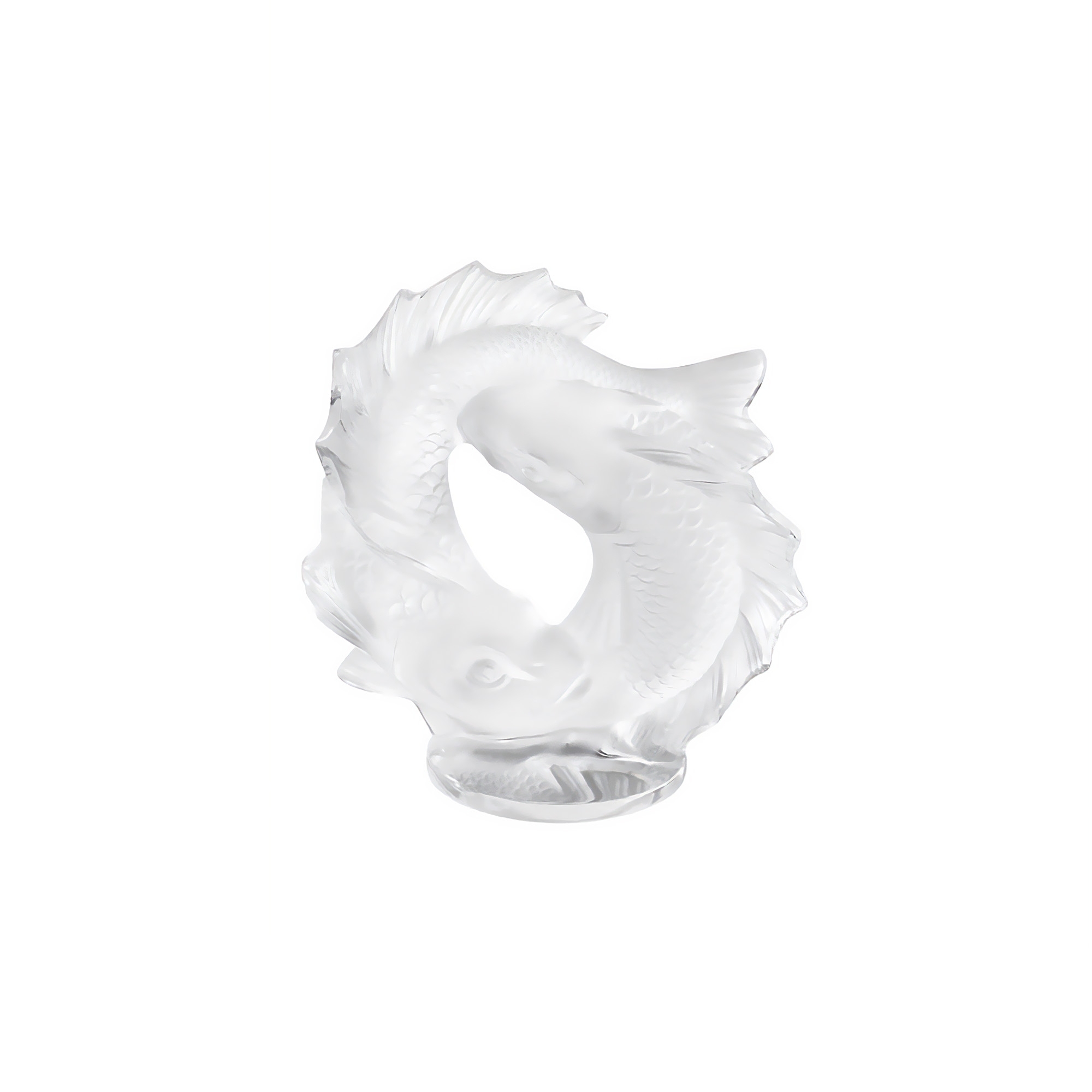 Scultura piccola 2 Poissons realizzata in cristallo. Raffigurante simboli di ricchezza e perseveranza, la scultura 2 Poissons di Lalique rappresenta due carpe Koi in un movimento infinito. Creato nel 1953 da Marc Lalique, il design è ora disponibile in una versione più piccola. Il cristallo satinato e rilucidato esalta la delicatezza delle scaglie accuratamente scolpite.