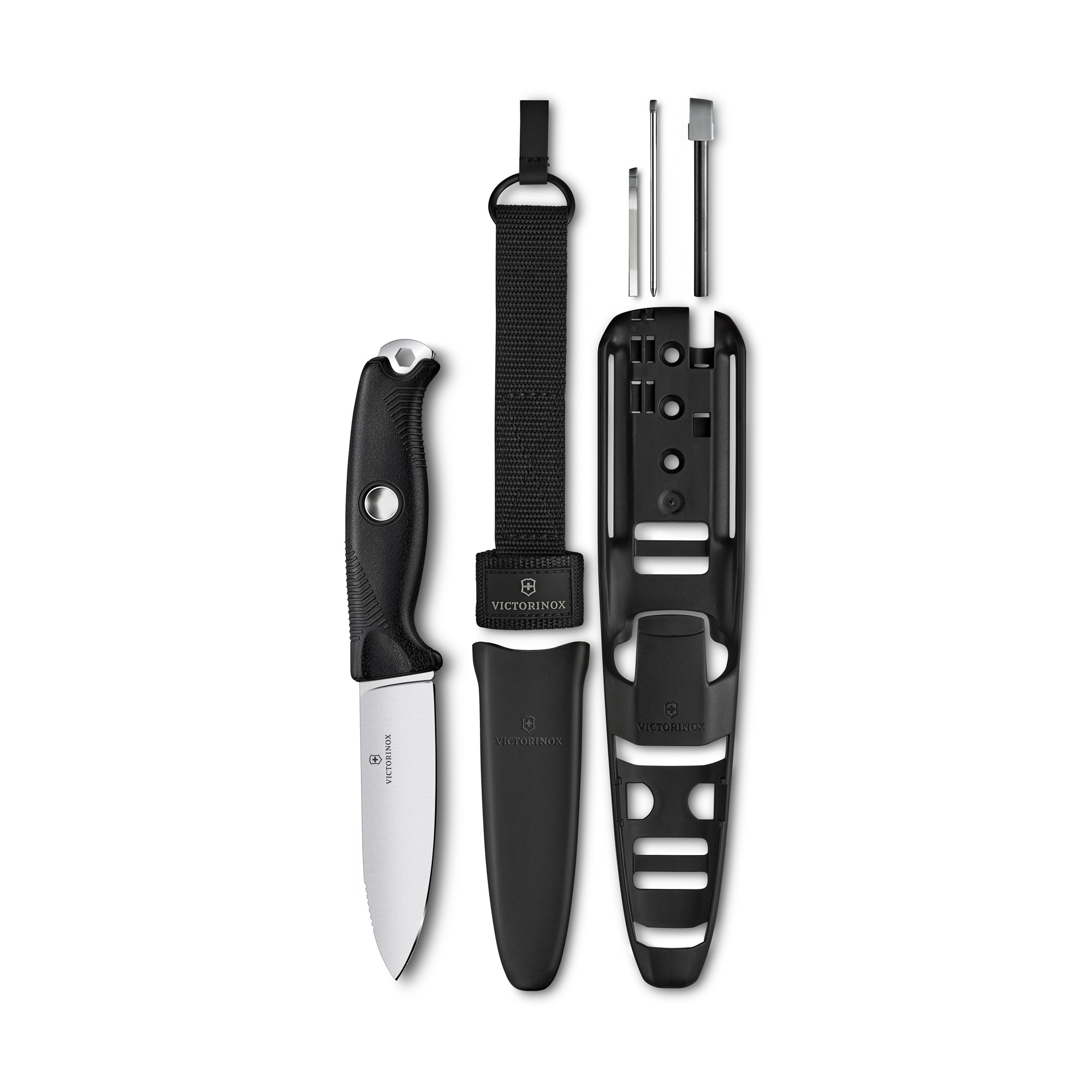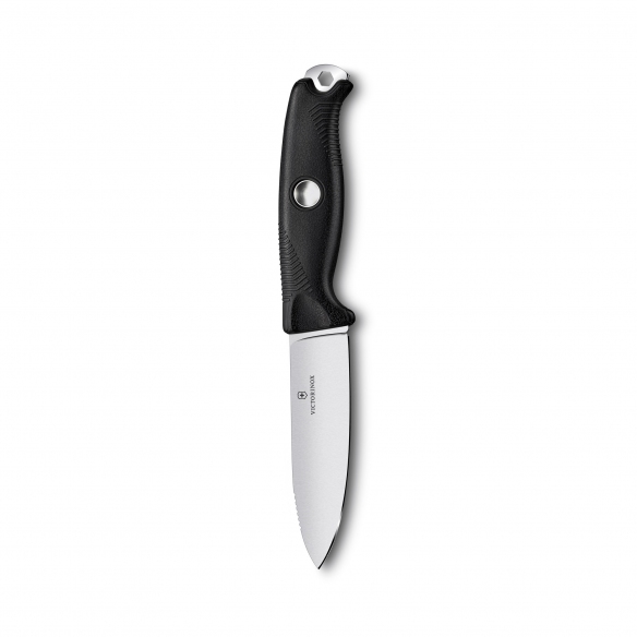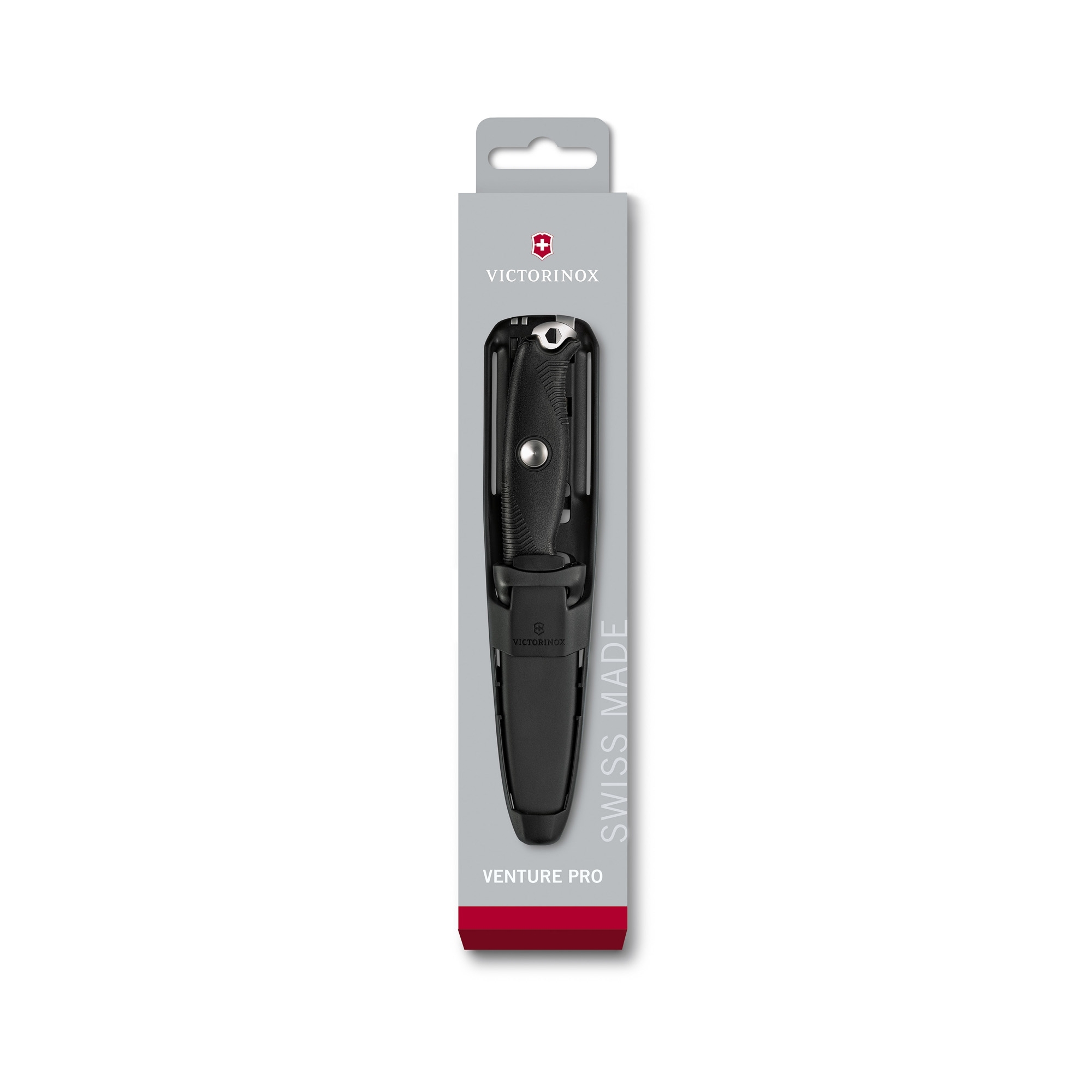 Coltello Venture Pro nero, realizzato da Victorinox in acciaio e TPE. Questo coltello è un bellissimo esempio di come funzionalità, praticità e design si uniscono in un semplice accessorio. Venture Pro è un coltello a lama a goccia fissa che affronta qualsiasi avventura con stile, e incarna l'eredità di qualità e ingegneria di precisione che Victorinox porta avanti da decenni. Le caratteristiche principali sono: lama da 10,5 cm, codolo sporgente, ripara buche ad arco, penna pressurizzata, pinzette e foro per cordoncino. Il manico è ergonomico, antiscivolo e offre una presa sicura e confortevole. Leggero ma resistente, il coltello Venture Pro nero è il compagno ideale per gli amanti delle attività all'aria aperta, dai campeggiatori agli escursionisti, grazie alla sua capacità di affrontare con facilità diverse sfide.