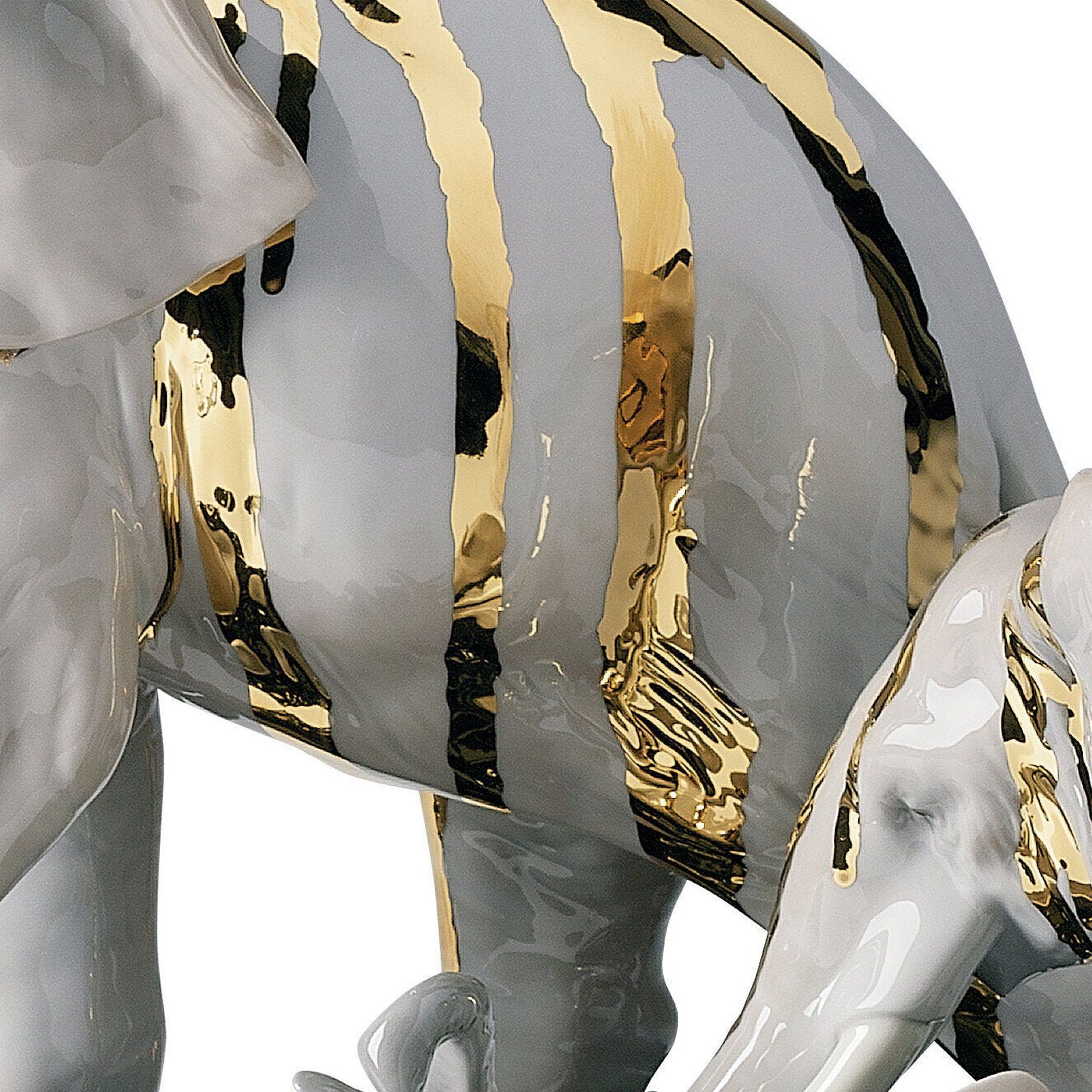 La figurina Celebrazione - Elefanti su roccia nera è un capolavoro che incarna maestosamente il legame familiare, realizzata da Lladró in porcellana lucida e metallo, materiali apprezzati per la loro resistenza e longevità. Questa splendida figurina cattura un momento dolcissimo e unico di una famiglia di elefanti che camminano su una roccia nera, il che simboleggia unione e forza. I dettagli in oro la rendono un'opera d'arte vera e propria, in grado di abbinarsi a ogni ambientazione e stile di arredamento: può fungere da aggiunta per un ufficio commerciale, oppure essere posizionata in un salotto dal design moderno. La scelta del nero per la roccia impreziosisce ulteriormente la scena, facendo risaltare la tonalità grigia dell'elefante. La figurina celebrazione è un omaggio alla savana africana, con i suoi iconici abitanti che evocano rispetto e maestosità. Qualsiasi dettaglio è curato alla perfezione, dal corpo degli elefanti alla pelle, dalle increspature della roccia ai colori, dimostrando l'eccellenza nell'uso della porcellana. Disegnato da Committee e scolpito dal Dipartimento Diseño y Decoración per Lladró.