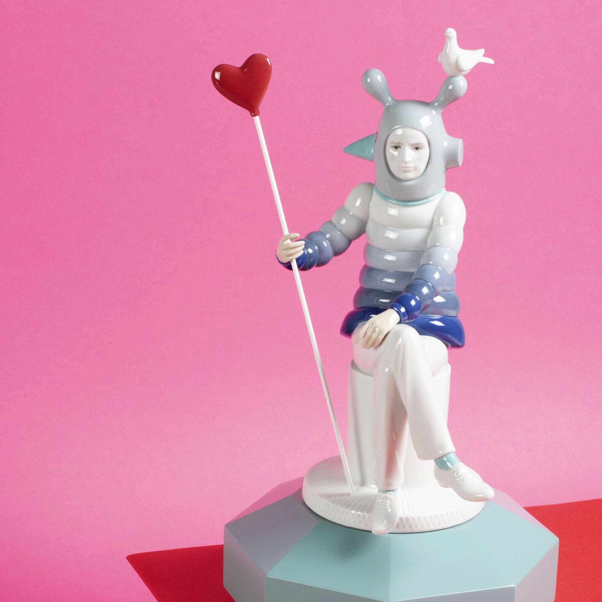 La figurina The Lover I rappresenta una straordinaria fusione tra artigianato tradizionale e audace design contemporaneo, realizzata da Lladró interamente in porcellana lucida, materiale che promette resistenza e longevità, decorato con dettagli in blu che fanno risaltare il rosso del cuore. Questa deliziosa statuetta ha un design divertente e innovativo, e nasce dalla fusione di un classico tema di Lladró, ovvero amore e giocosità; questa opera in particolare rappresenta un amante dall'aspetto elegante e spensierato. La posizione del personaggio e gli accessori che porta con sé aggiungono un ulteriore livello di narrazione, invitando l'osservatore a riflettere sulle molteplici sfaccettature dell'amore. Grazie ai suoi colori e al suo stile, The Lover I si sposa armoniosamente con qualsiasi ambiente e stile di arredamento: può essere collocato in una casa o in un ufficio commerciale, in una camera da letto dal design classico o in un soggiorno minimalista. Quest'opera rappresenta un omaggio all'amore attraverso gli occhi del designer, donando una visione unica che arricchisce la collezione di ogni amante dell'arte. Disegnata da Jaime Hayon e scolpito da Marco Antonio Noguerón per Lladró.