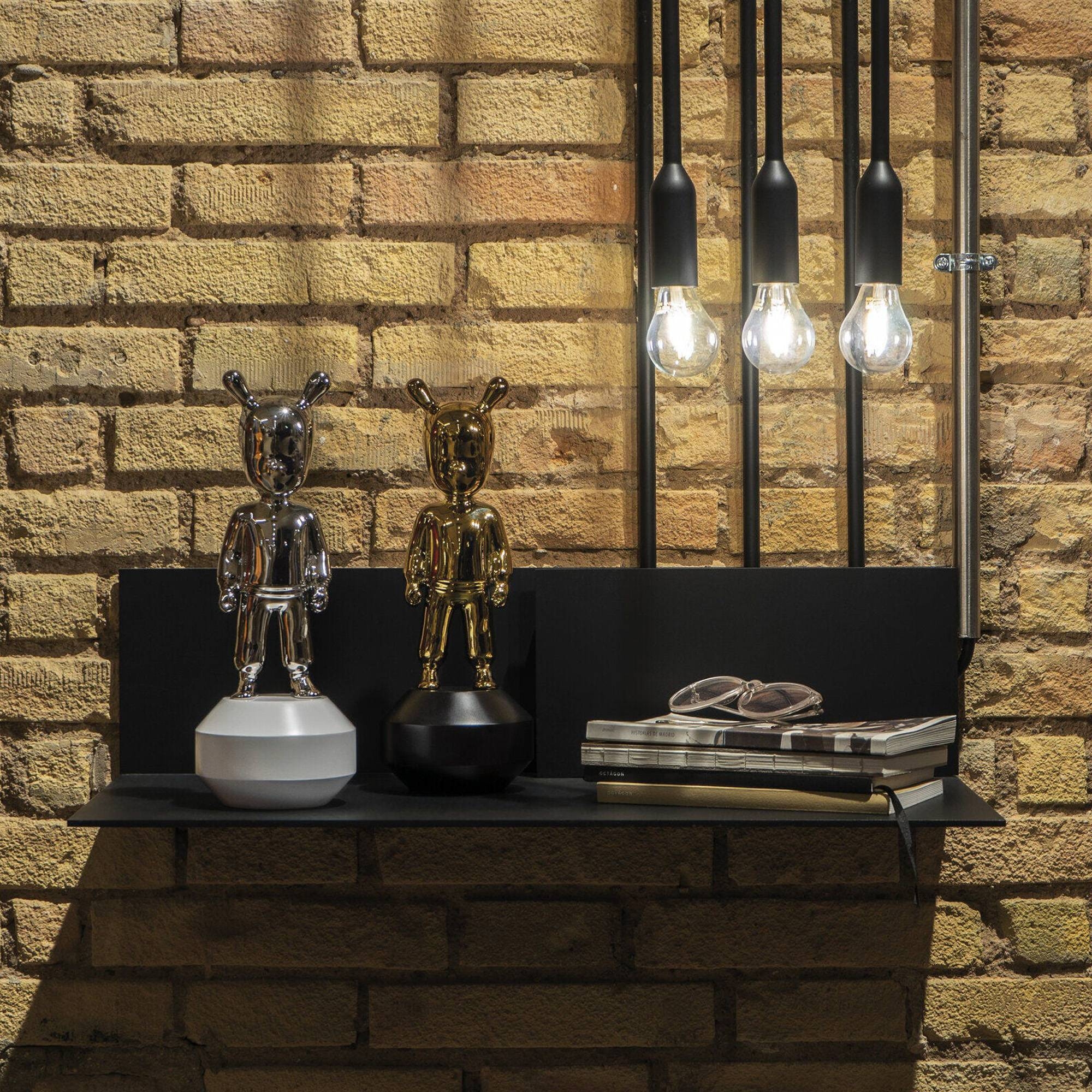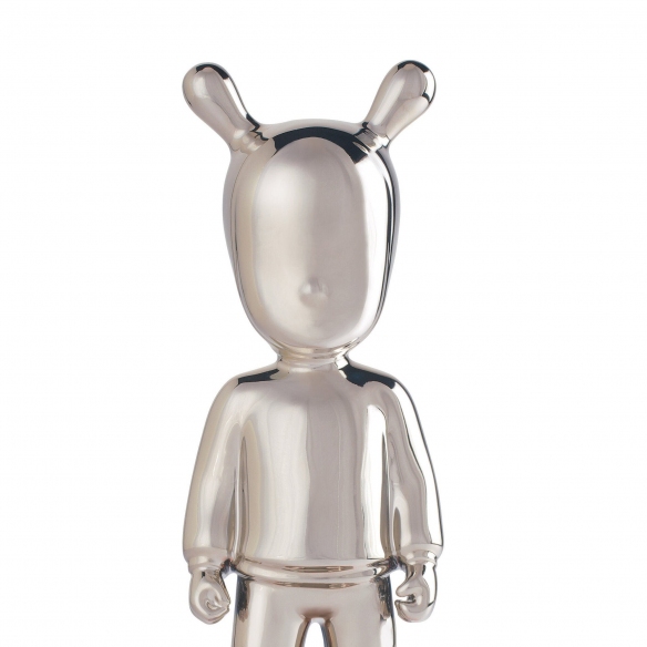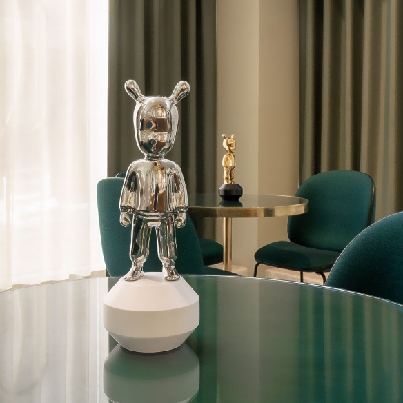 La figurina The Silver Guest, modello piccolo, è una fantastica e simpatica opera d'arte realizzata da Lladró interamente in porcellana di colore argento lucido, e con base in legno bianca, materiali ammirati per la loro eleganza e longevità. The Silver Guest ha un design unico e moderno, in grado di regalare un tocco di eleganza alla tua casa; questa figurina è abbinabile a qualsiasi ambientazione e stile di arredamento: che sia posizionata all'interno di una biblioteca dal design classico, all'interno di un salotto minimalista oppure sul comodino in una camera da letto all'avanguardia, The Silver Guest catturerà lo sguardo di tutti i tuoi amici e parenti. Questa figurina si pone come un invito al dialogo creativo e raffinato, diventando un'icona che porta l'arte contemporanea nelle case. Il modello piccolo è perfetto per collezionisti e amanti dell'arte che desiderano un pezzo dal carattere forte ma che si adatti anche a spazi limitati. Questo prodotto di arredamento incarna la voglia di sperimentare negli infiniti confini dell'arte della porcellana, portando sempre con sé l'inconfondibile savoir-faire di Lladró. Disegnato da Jaime Hayon e scolpito da Raul Rubio per Lladró.