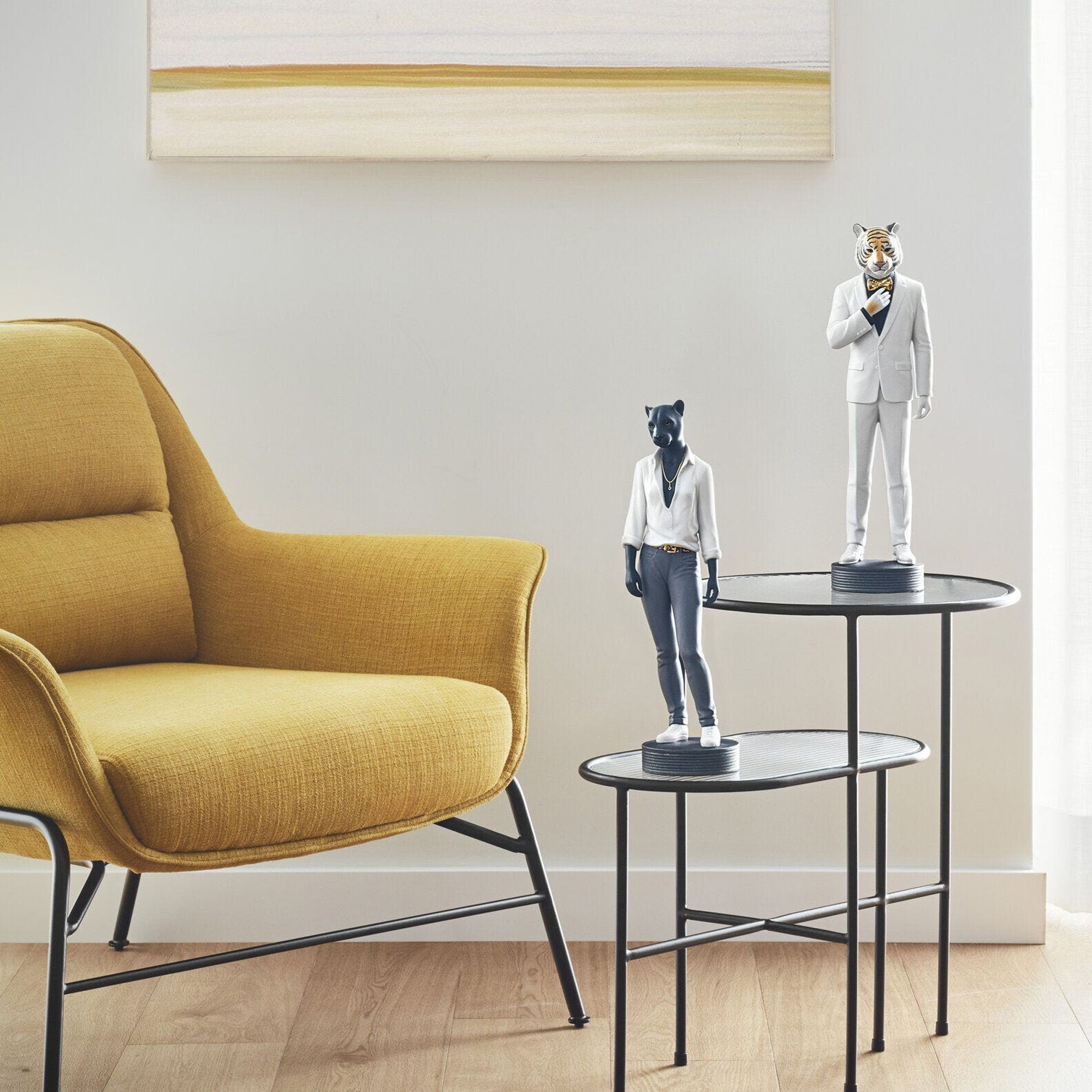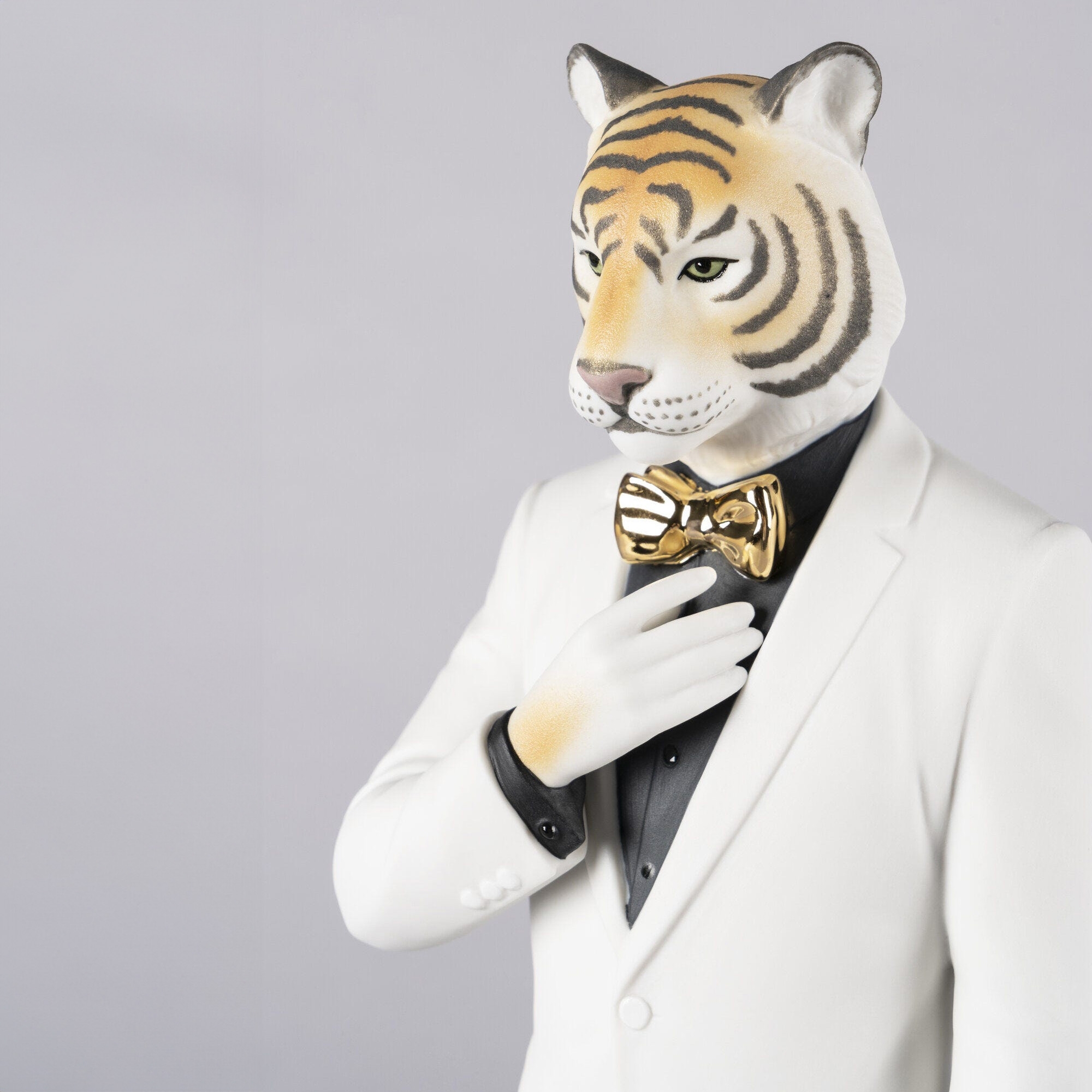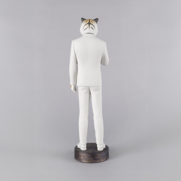 La figura dell'uomo tigre è una spettacolare scultura realizzata da Lladró interamente in porcellana opaca, materiale che garantisce resistenza e notevole durabilità, decorata con dettagli in bianco, grigio e oro. Questa splendida figura dell'uomo tigre è ispirata alla Cina antica, dove la tigre è il Re di tutti gli animali; grazie al suo design unico e minimalista, questa scultura si abbina perfettamente a ogni ambientazione e stile di arredamento: che sia posizionata sopra il comodino in camera da letto, oppure in salotto dallo stile classico, questa figura dell'uomo tigre catturerà lo sguardo dei vostri ospiti e sarà al centro di tutte le conversazioni. Con le sue dimensioni occupa un posto d'onore in ogni collezione. Infatti, la figura non è solo un pezzo decorativo, ma un simbolo dell'impegno di Lladró verso l'artigianato, la creatività e la convergenza tra arte e natura. La figura dell'uomo tigre non è solo un oggetto di arredamento, bensì un emblema della parte indomabile dello spirito umano, un promemoria della nostra affinità con il mondo naturale e un pezzo da collezione che ispira ammirazione e riflessione. Disegnato da Marco Antonio Noguerón per Lladró.