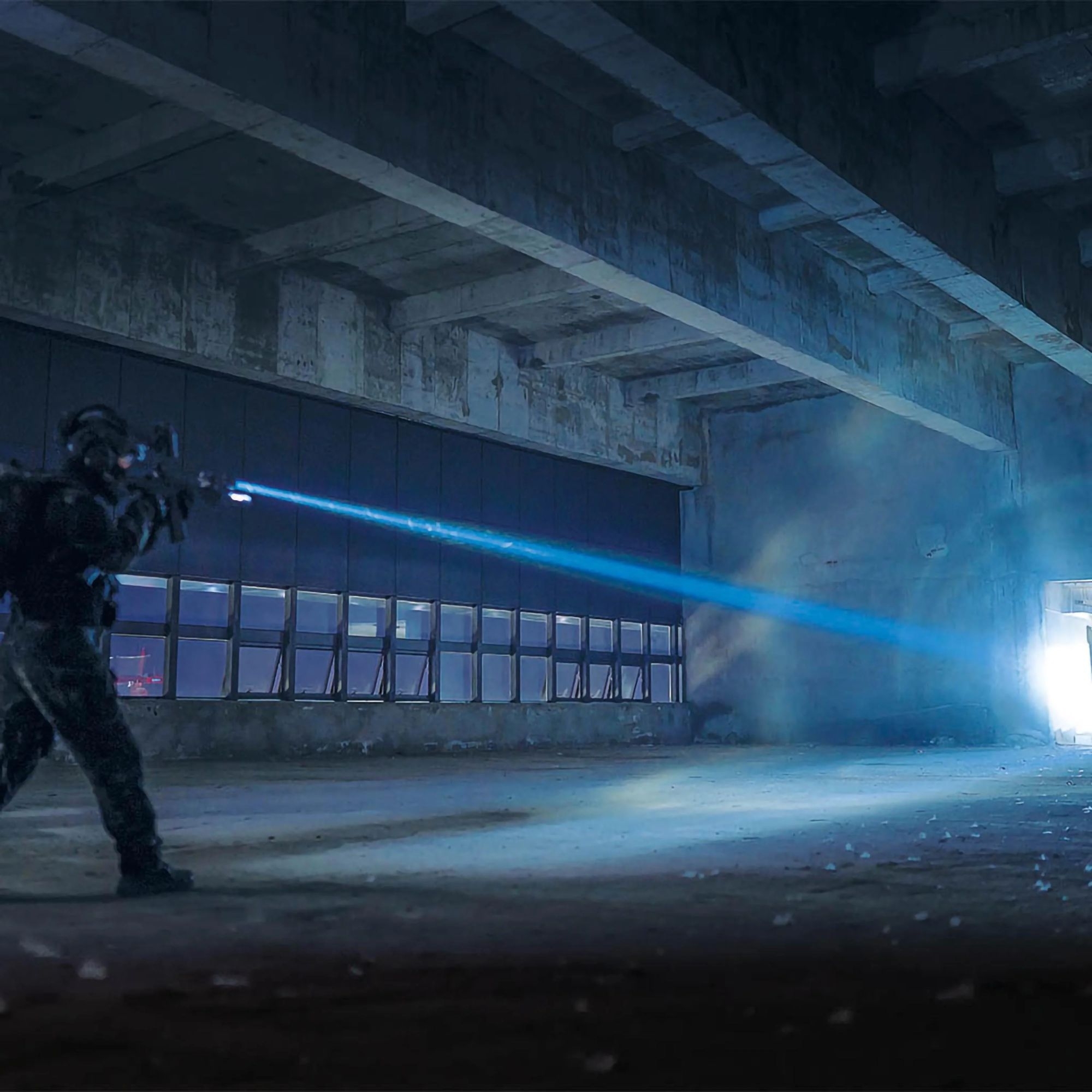 Torcia laser bianca ricaricabile ad alte prestazioni con due modalità di luce differenti e Strobo. La luce laser crea un fascio di luce più definito rispetto a quello di una torcia LED standard con poca luce di ritorno, può arrivare fino ad una lunghezza sbalorditiva di 1500 m. Realizzata per attività all’aperto dove le distanze richiedono un fascio luminoso potente e preciso come la caccia, la ricerca e il soccorso.