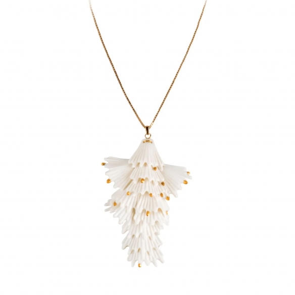 Il ciondolo allungato Actinia è un meraviglioso gioiello che cattura immaginazione e sguardi, realizzato da Lladró in porcellana bianca opaca, retro in pelle e parti metalliche in argento sterling 925 placcato oro 3 micron, e disegnato dall'acclamata gioielliere Raluca Buzura. Questo splendido pendente è ispirato all'incredibile diversità e bellezza della vita marina e può essere facilmente abbinato a diversi look, il che lo rende estremamente versatile: che venga indossato per aggiungere un tocco di eleganza a un abbigliamento casual o come complemento distintivo per occasioni più formali, Actinia questo gioiello non passerà inosservato. Il ciondolo allungato Actinia non è solo un accessorio, ma un vero e proprio ponte tra natura marina e arte che comunica la sensibilità e l'amore per il la raffinatezza. Disegnato da Raluca Buzura per Lladró.