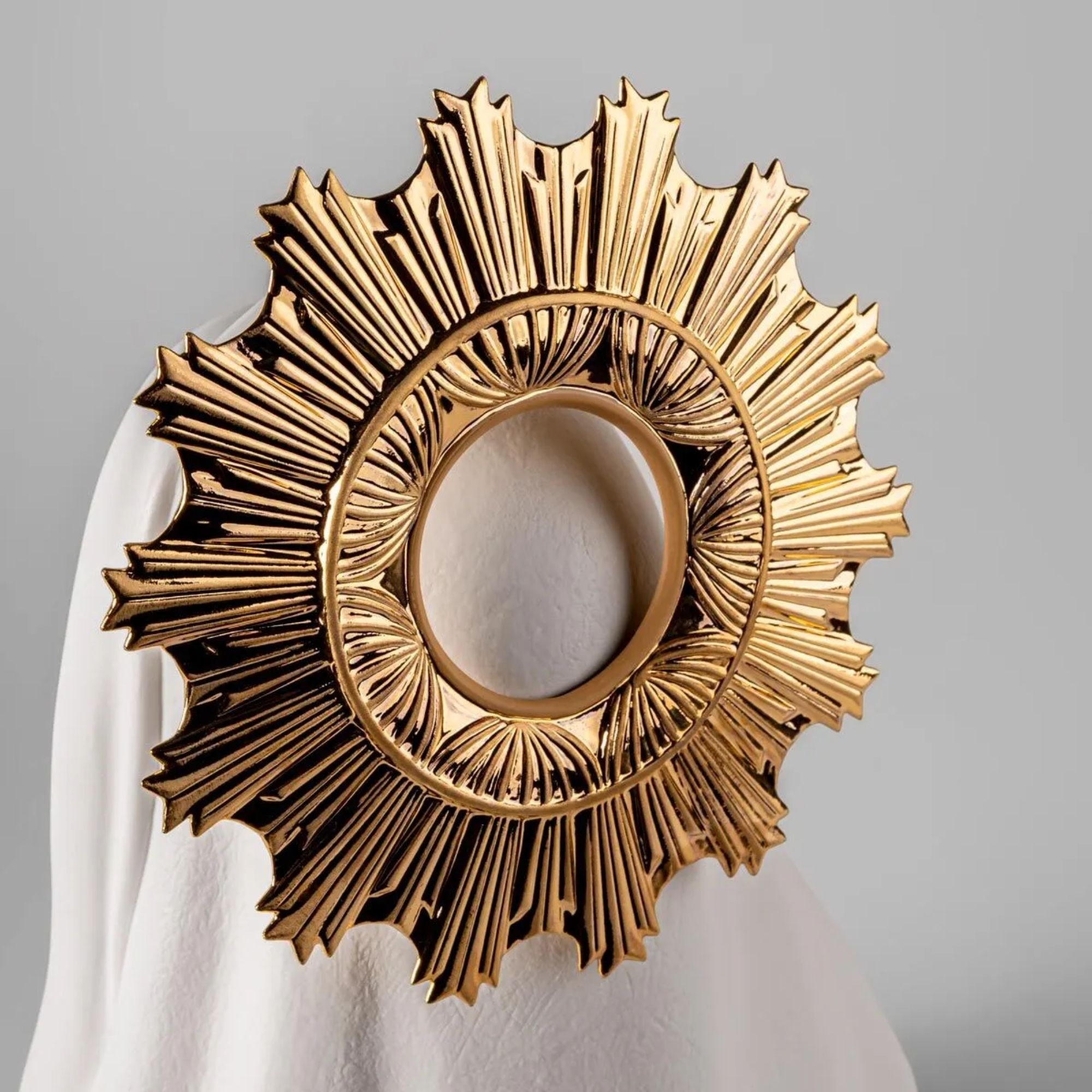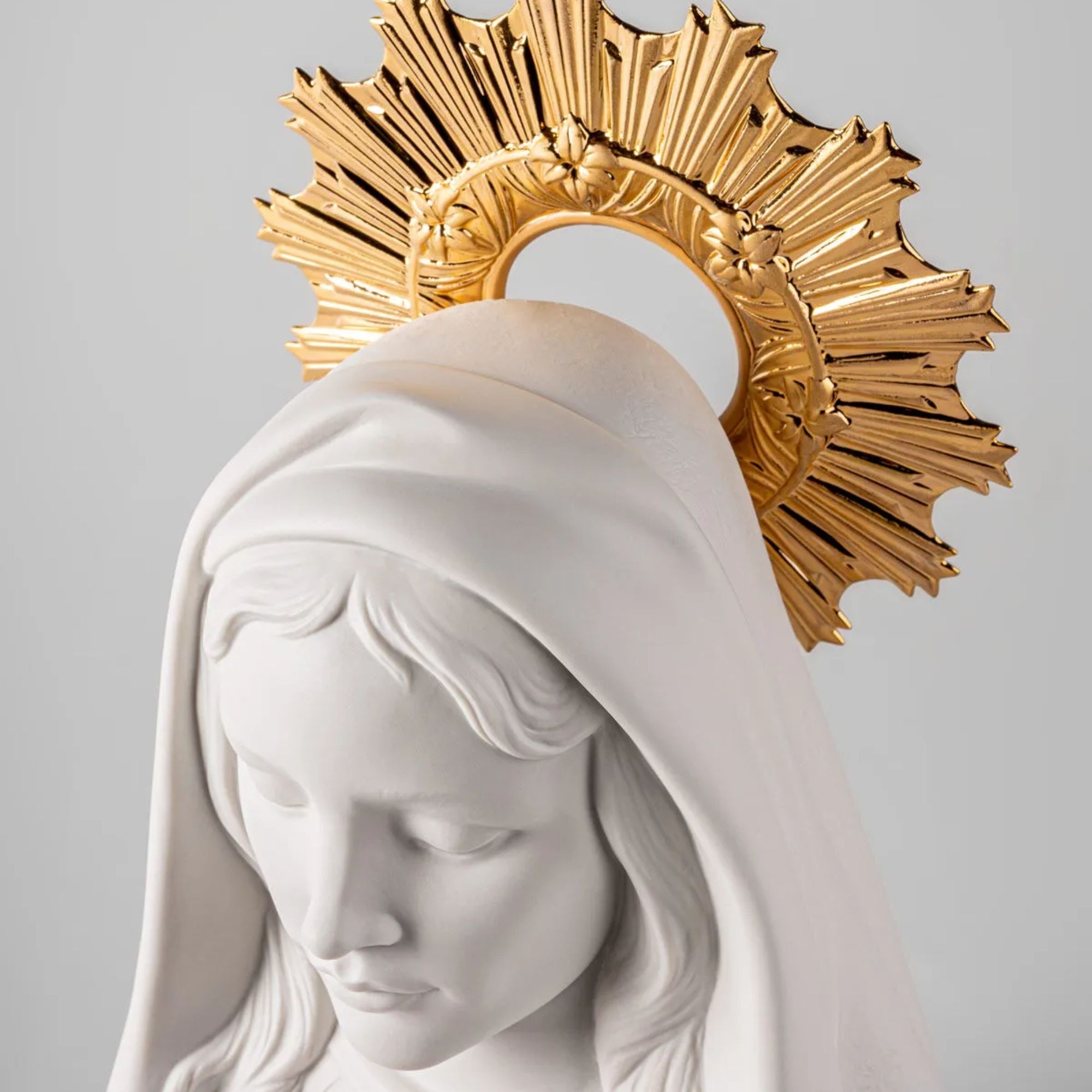 La scultura in porcellana Cuore Immacolato Di Maria è un prezioso capolavoro realizzato a mano in porcellana dagli abili artigiani di Lladró. Questa splendida scultura rappresenta il suo amore puro e incondizionato per suo figlio Gesù e per l'umanità, e si ispira alla tradizione dell'immaginario religioso e alle opere dei grandi maestri della storia dell'arte. Caratterizzata da una pacifica aura dorata che simboleggia santità e purezza, Maria è raffigurata con un cuore rosso vivo ben visibile sul petto, simbolo del suo amore ardente e compassione per l'umanità. Questo cuore è circondato da 20 fiori modellati minuziosamente con pistilli blu impreziositi da dettagli dorati che aggiungono eleganza. Questa splendida scultura porta pace e preghiera in qualsiasi ambientazione: dalla cucina all'ufficio, dal salotto alla camera da letto. La scultura ispira riverenza e contemplazione, ed è perfetta per chi cerca un contatto con il divino o desidera esprimere la propria devozione religiosa attraverso l'arte.