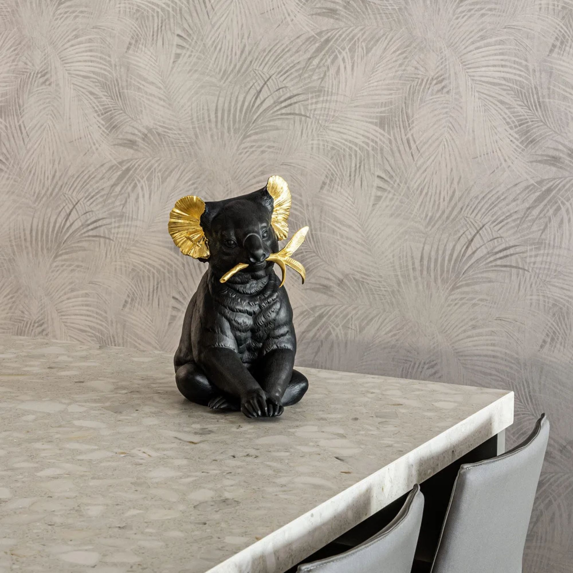 Scultura Koala Nero-Oro (edizione limitata) realizzata in porcellana. Il Koala Nero-Oro della collezione Boldblack incarna il perfetto equilibrio tra naturalismo e avanguardia che contraddistingue questa serie. L'opera offre una prospettiva unica sul mondo animale attraverso creazioni che spiccano per una modellazione realistica e meticolosa, arricchita da una decorazione bicolore in nero e oro. Questo pezzo si presenta come una interpretazione audace e innovativa del koala, uno degli animali più amati e iconici dell'Australia, trasformato qui in una dimensione nuova e sorprendente. Realizzato in porcellana nera opaca, ogni dettaglio della scultura è messo in risalto, mentre il contrasto con rifiniture in oro lucido aggiunge un effetto decorativo estremamente attraente e raffinato. Il koala non è soltanto una tenera creatura che si arrampica sugli alberi; nelle culture indigene australiane, rappresenta saggezza e adattabilità, spesso visto come custode di conoscenze profonde sull'ambiente e la comunità. Questa scultura celebra non solo la bellezza estetica dell'animale, ma anche il suo significato culturale come simbolo di conservazione e rispetto per il mondo naturale. Perfetto per gli amanti dell'arte decorativa e della fauna, la scultura Koala Nero-Oro è non solo un'aggiunta straordinaria a qualsiasi collezione, ma anche un pezzo che stimola riflessioni più profonde sul nostro rapporto con la natura e le culture ancestrali. Un'edizione limitata che conferisce un tocco di eleganza e significato all'ambiente domestico o lavorativo in cui viene collocato.