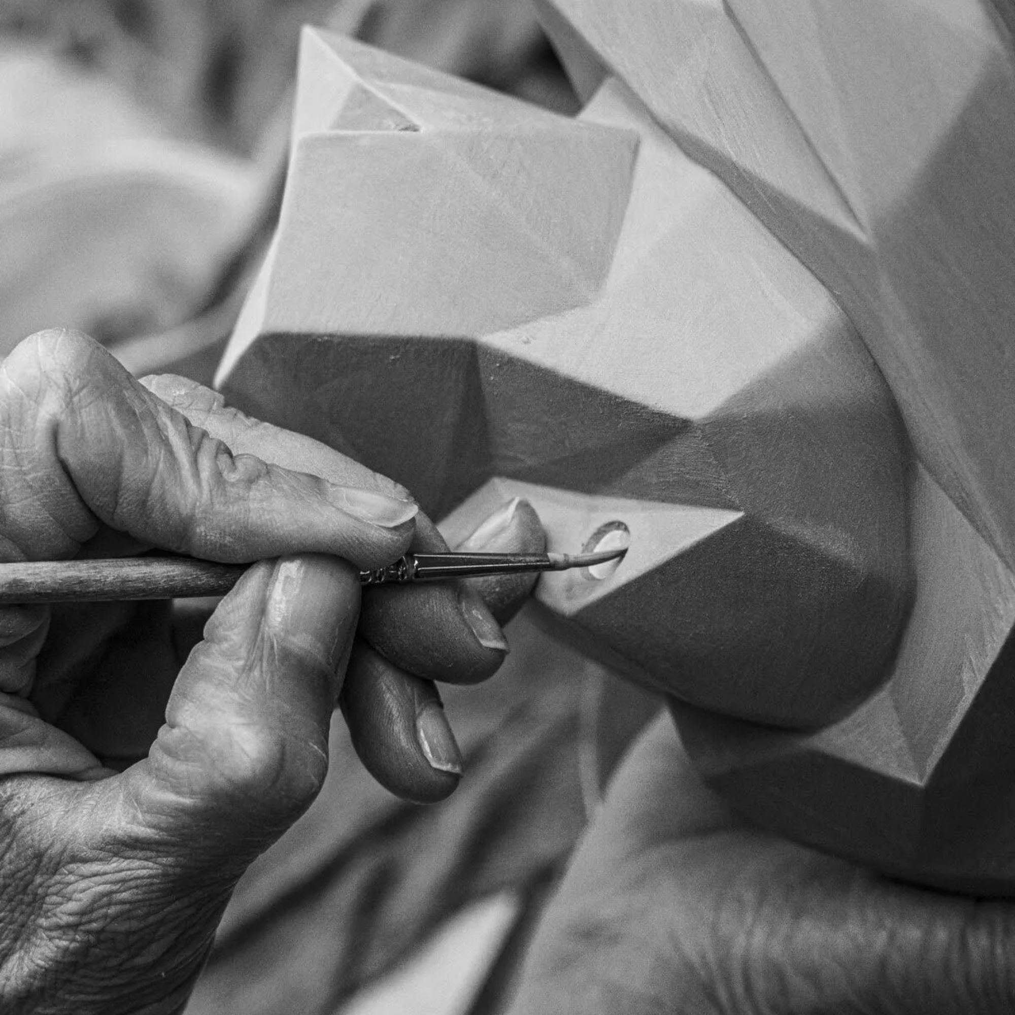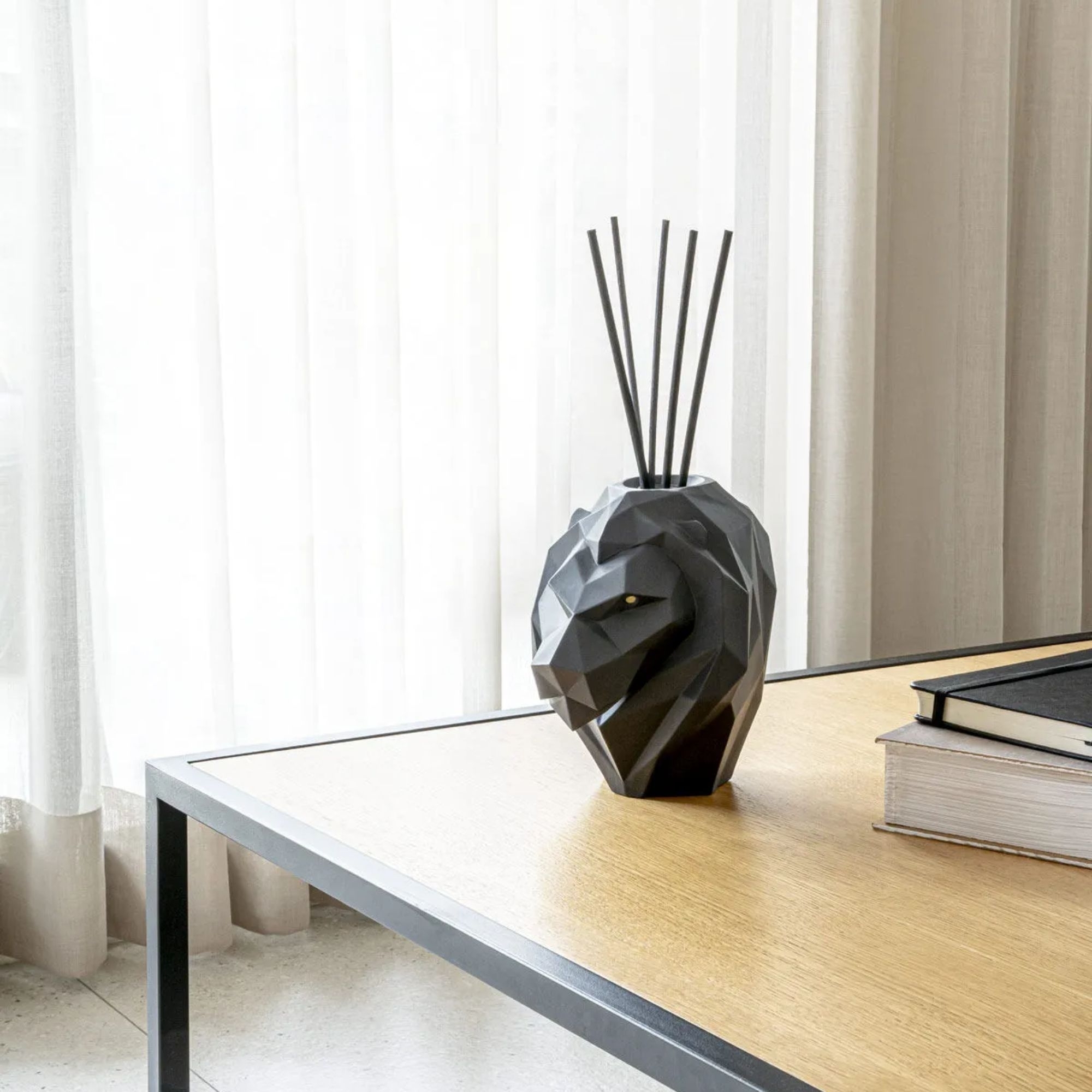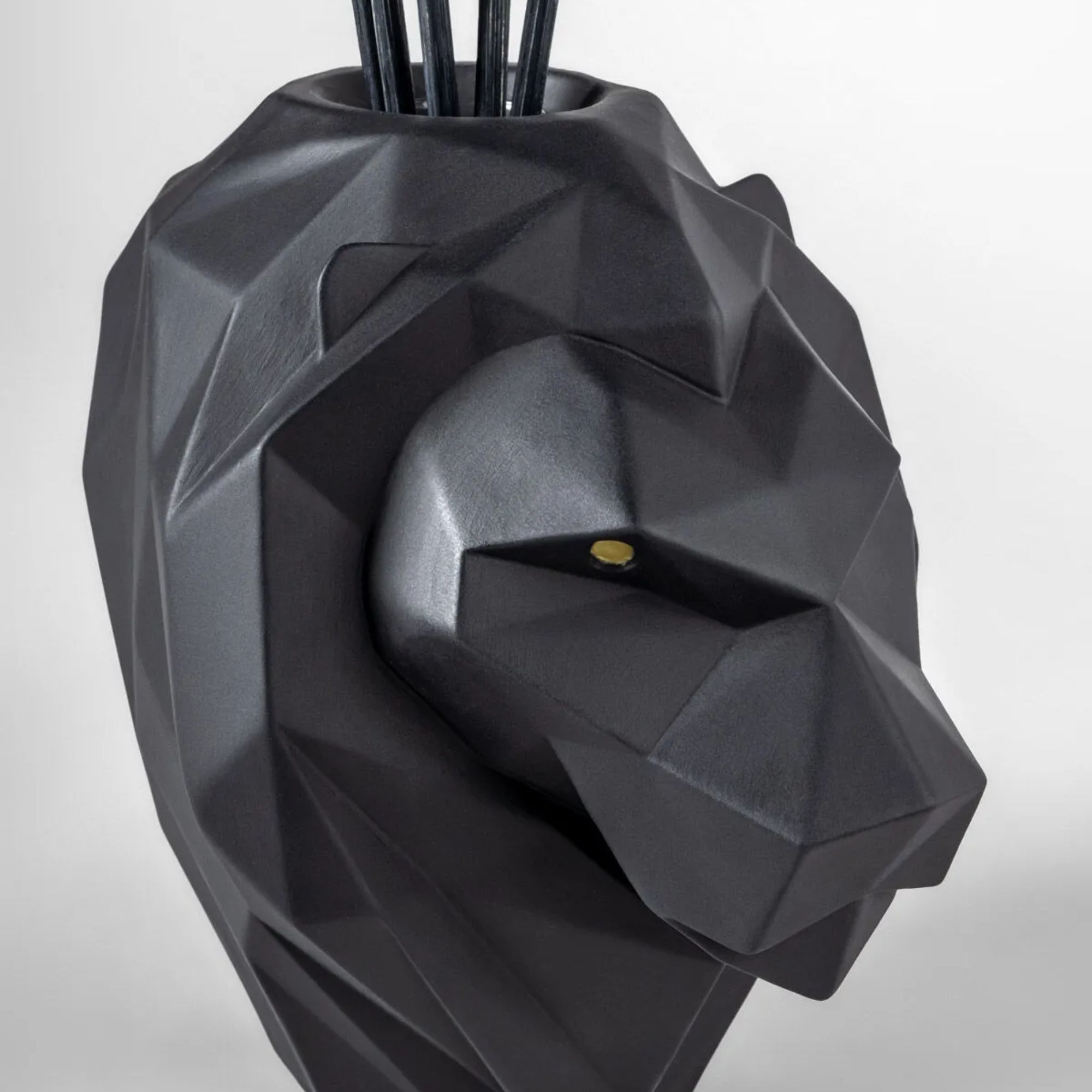 Diffusore di profumo Leone (unbreakable spirit) realizzato in porcellana. Ispirato all'arte giapponese dell'origami, questo diffusore artigianale in porcellana con finitura nera opaca trasforma ogni ambiente con il suo design unico e la sua fragranza avvolgente. La potente forma della testa del leone, simbolo di forza e coraggio, si fonde con l'estetica geometrica dell'origami, creando un oggetto di grande impatto scultoreo e decorativo. Perfetto per chi desidera aggiungere un tocco di nobiltà e un'atmosfera raffinata agli spazi, il Diffusore di Profumo Leone - Unbrekable Spirit è la scelta ideale per arricchire la casa con stile e personalità.