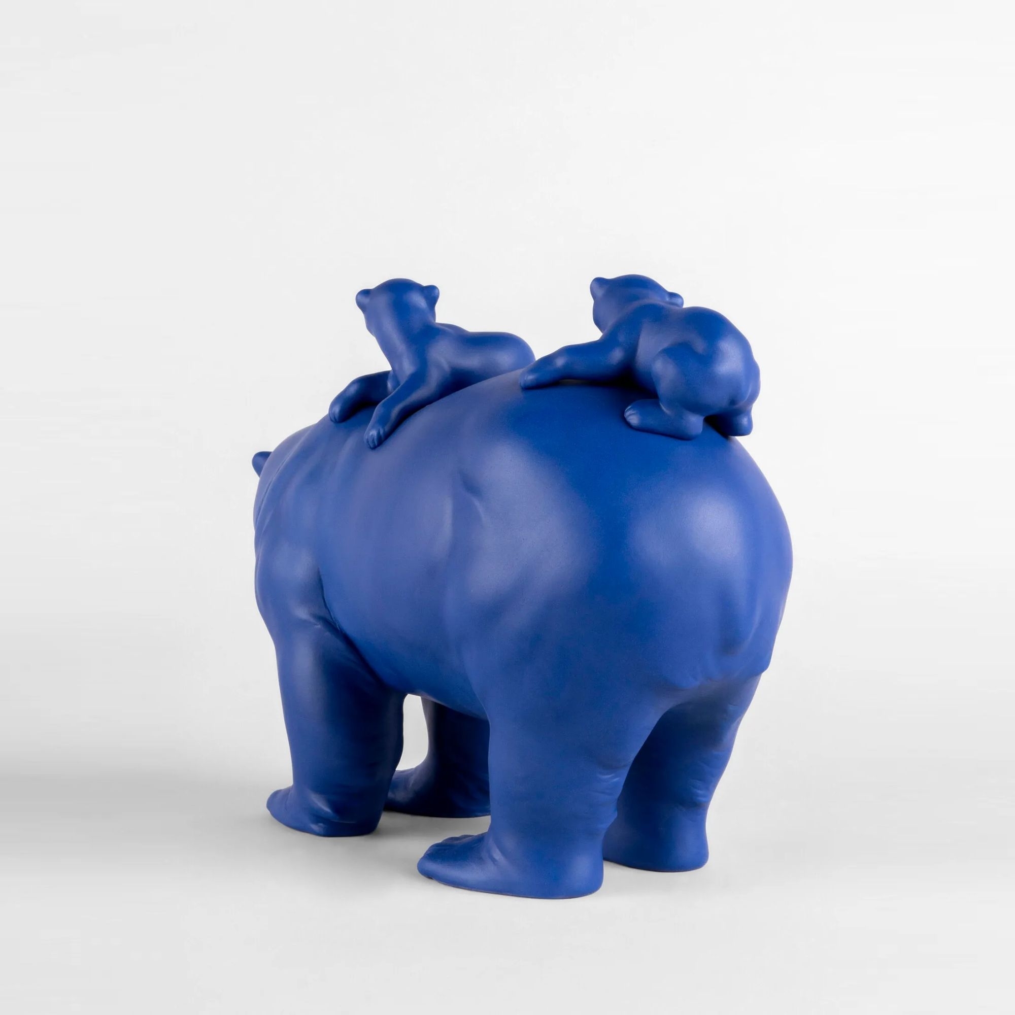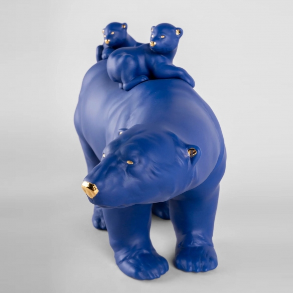 Scultura "Mamma Orsa E I Suoi Piccoli" realizzata in porcellana. Con lo splendido contrasto dell'opaco blu Klein e le finiture in prezioso oro, questa scultura raffigura l'imponente figura dell'orso polare nell'abbraccio protettivo con i suoi piccoli. Una vera espressione di nobiltà e delicatezza, ideale per chi desidera un elemento d'arredo sofisticato e di grande impatto visivo. Porta la bellezza delle terre artiche direttamente nella tua casa o ufficio con questa elegante e maestosa opera d'arte in porcellana.