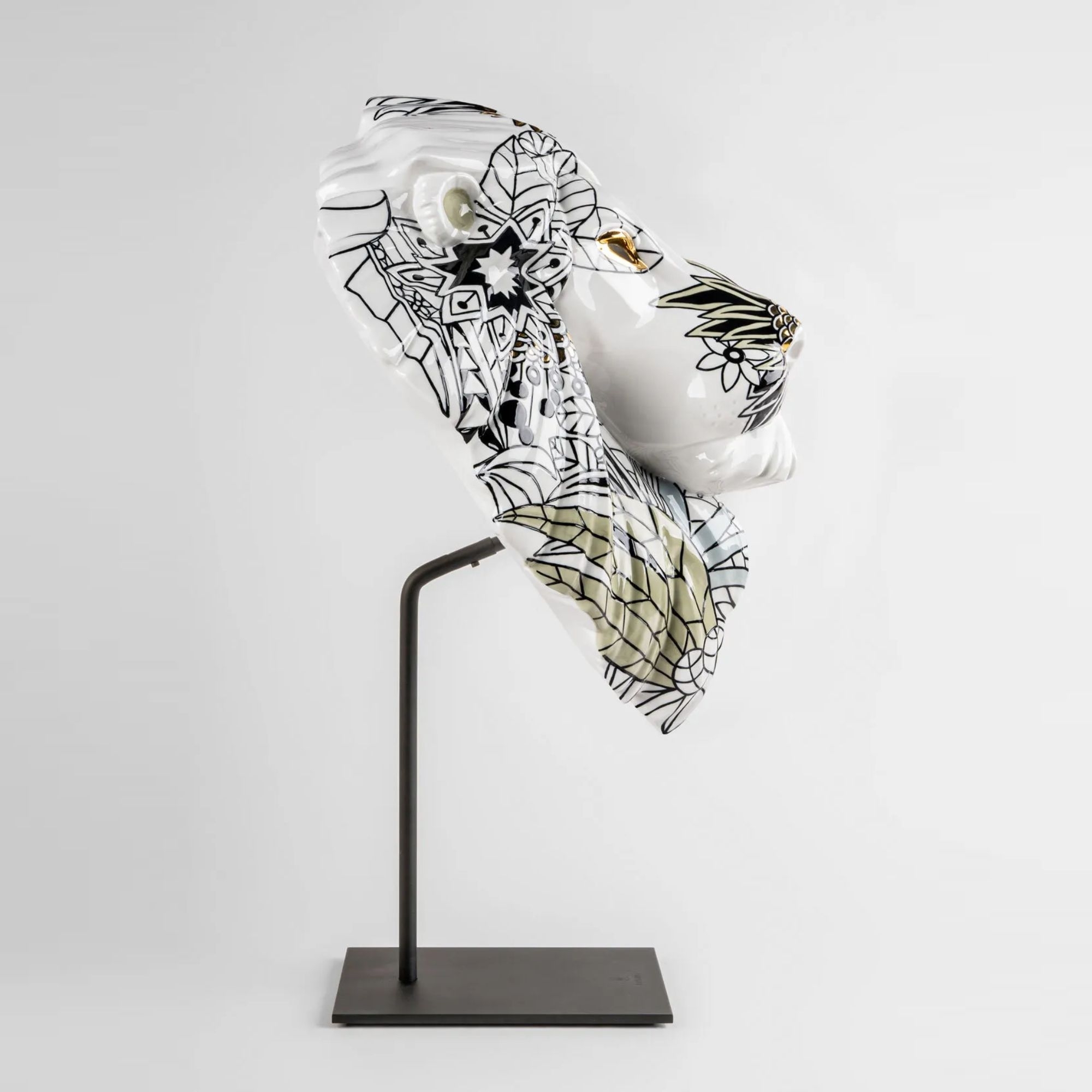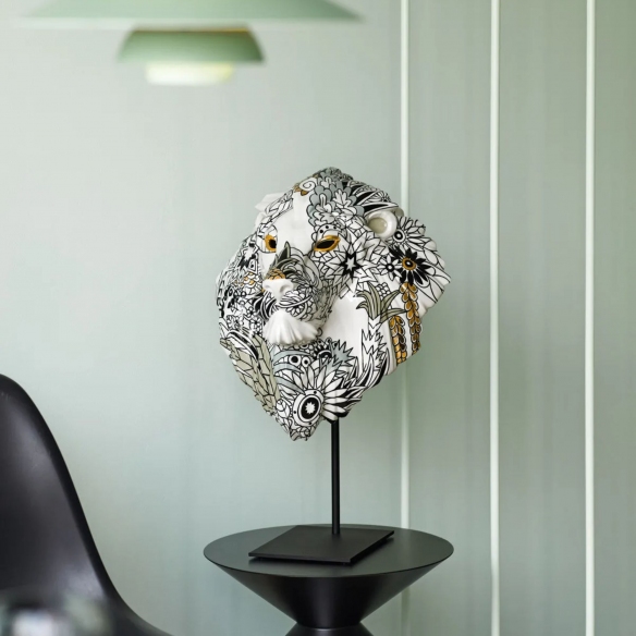 Scultura Maschera Leone / Natura Selvaggia realizzata in porcellana. Ispirata alle affascinanti maschere tradizionali africane, la scultura Maschera Leone / Natura Selvaggia appartiene alla collezione Fierce Portraits. Questa collezione si arricchisce di un nuovo, sorprendente capolavoro grazie alla maestria degli artisti di Lladró, che ci portano alla scoperta di territori inesplorati attraverso questa innovativa interpretazione. La maschera di leone si veste di un'incredibile fantasia floreale che ne rinnova il carattere, con un design e linee di tendenza contemporanea in primo piano. La porcellana bianca serve da tela, su cui spiccano con intensità tratti neri e dettagli dorati. Questo pezzo rappresenta un esempio eccezionale di come l'arte tradizionale possa incontrare la modernità, trasformandosi in un elemento d'arredo in grado di catturare lo sguardo e arricchire qualsiasi ambiente con un tocco di eleganza e fascino misterioso.