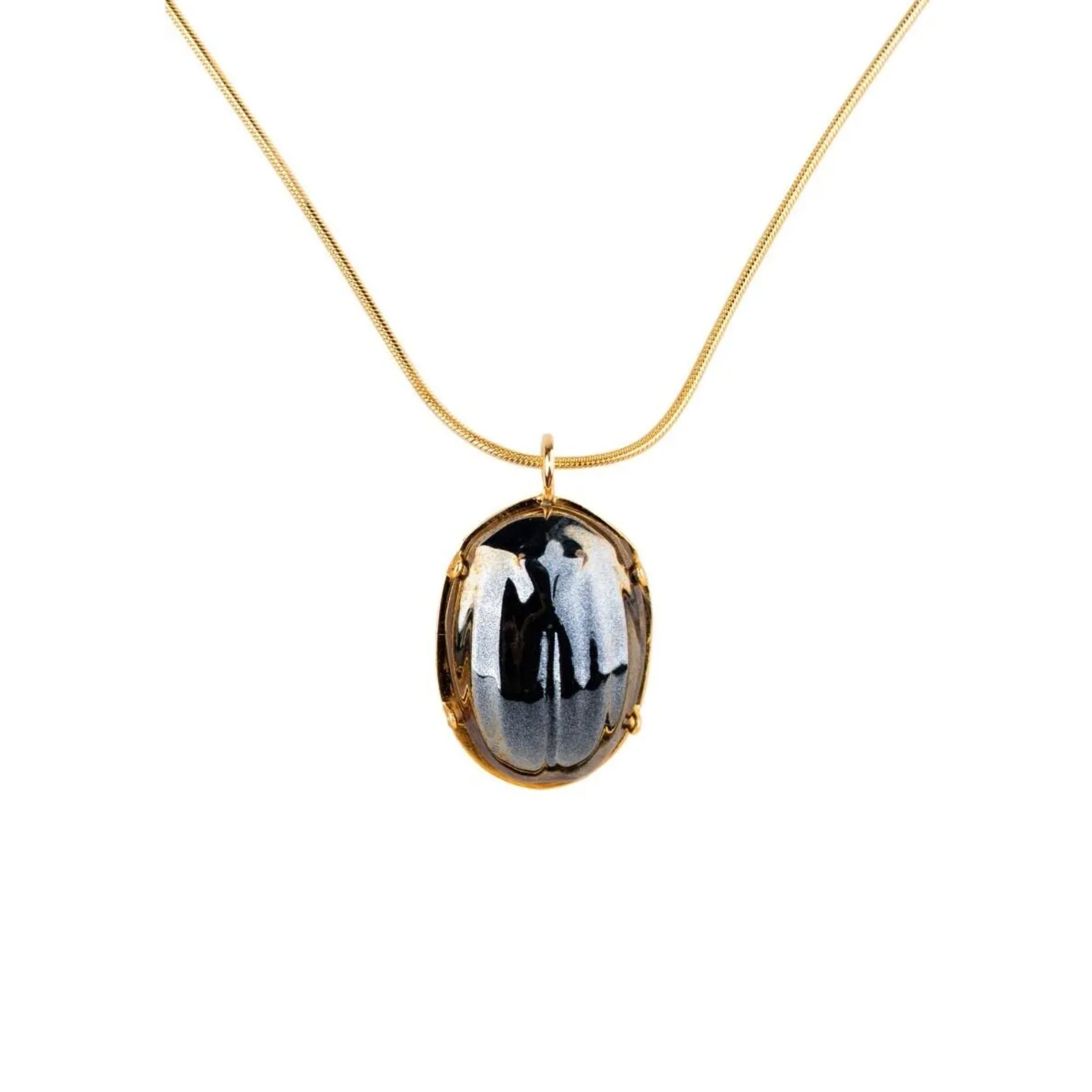 Ciondo lo Scarab realizzato in porcellana con catenina in argento placcato oro. Questo ciondolo, finemente lavorato in porcellana e argento placcato oro, rappresenta lo scarabeo, venerato dagli antichi Egizi come simbolo di forza vitale e rigenerazione. La sua forma accuratamente scolpita e i dettagli minuziosi ne fanno un accessorio unico e pregnante. Indossare il Ciondolo Scarab significa non solo arricchire il proprio stile con un gioiello di raffinata bellezza, ma anche connettersi con l'energia ancestrale di uno dei più grandi misteri dell'antichità. Ideale per chi cerca un pezzo che unisca storia, cultura e un significato profondo.