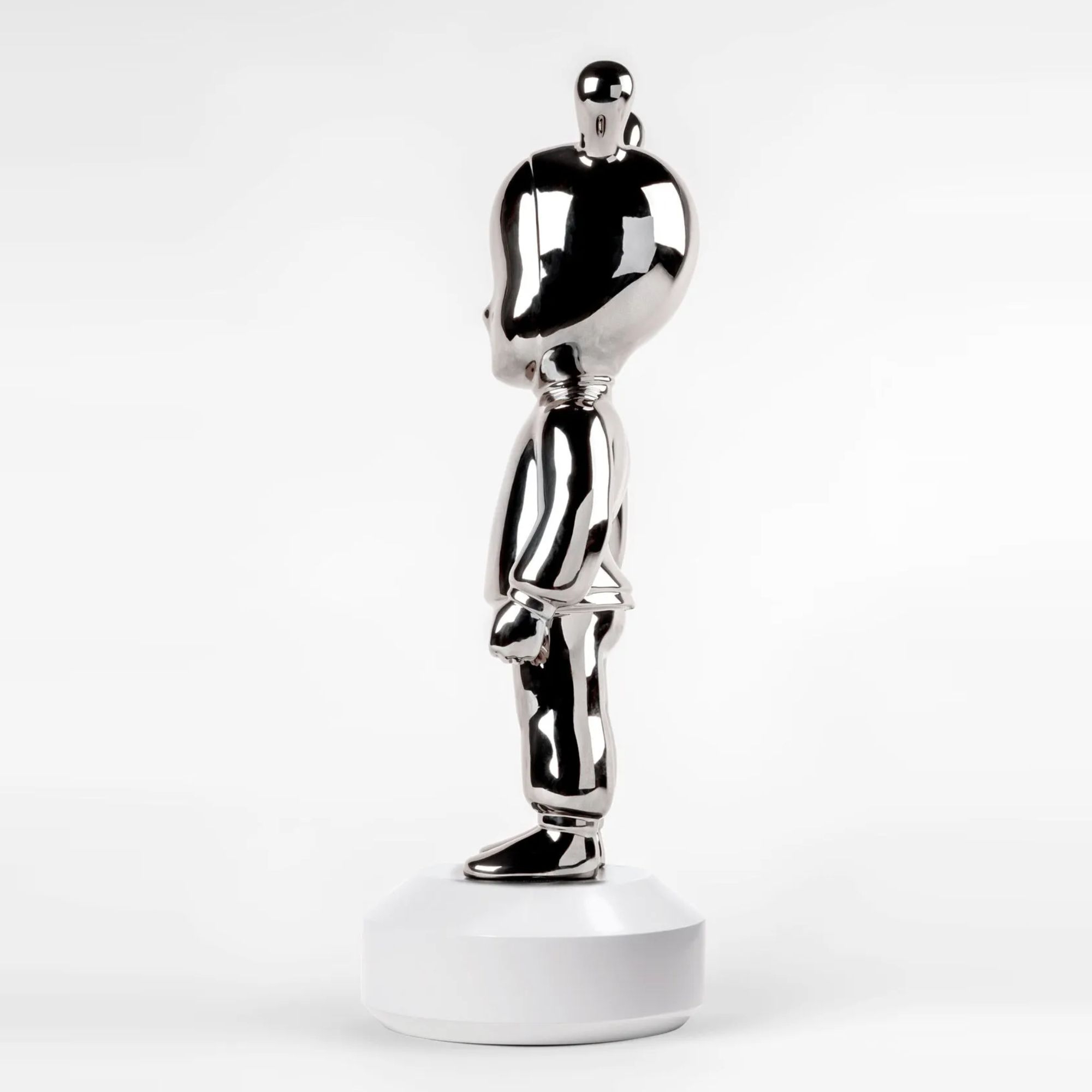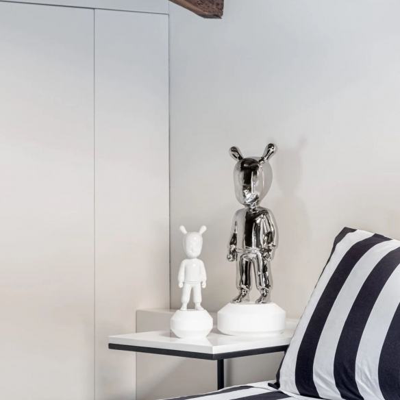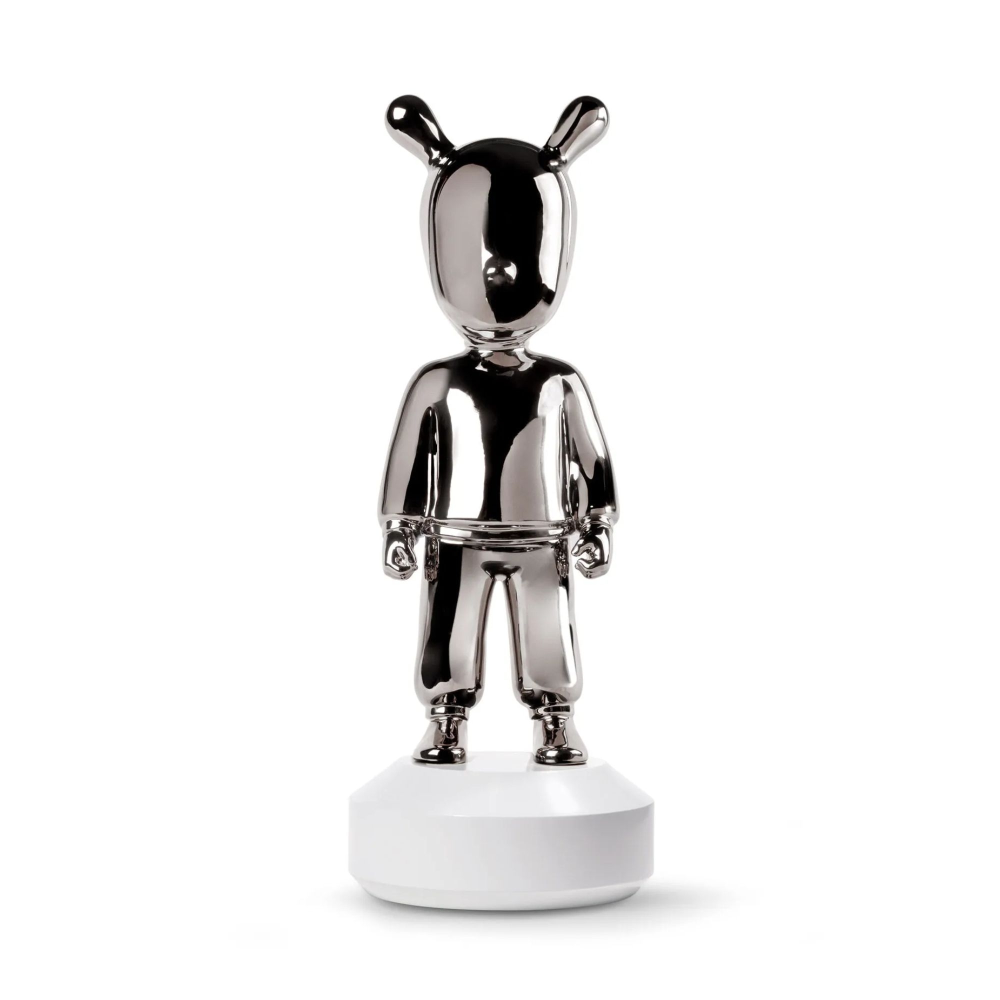Scultura in porcellana The Silver Guest Big realizzata in porcellana. Questa straordinaria opera d'arte nasce dalla brillante mente di Jaime Hayon, un designer di fama mondiale. The Guest è più di una semplice scultura; è una tela in continuo divenire che si veste delle visioni creative degli artisti più vari e stimolanti del momento. La nostra serie vanta collaborazioni con nomi del calibro di Camille Walala, Henn Kim, Ricardo Cavolo, e lo stesso Hayon, offrendo una varietà senza precedenti e un dialogo aperto tra forme, colori e espressioni artistiche. La collezione The Guest, nota per essere una delle più riuscite del nostro catalogo, propone oltre alle edizioni limitate create in collaborazione, una gamma di soggetti monocromatici che esprimono al meglio la versatilità e la ricchezza cromatica del nostro marchio. Dalle delicate tonalità pastello ai vibranti colori metallici di tendenza, c'è sempre una versione di The Guest che si adatta al tuo stile. In questa specifica versione, The Silver Guest Big si distingue per una finitura monocromatica in lustro argentato, che conferma come ogni Guest, indipendentemente dalla palette scelta, sappia catturare lo sguardo e incantare con la sua presenza.