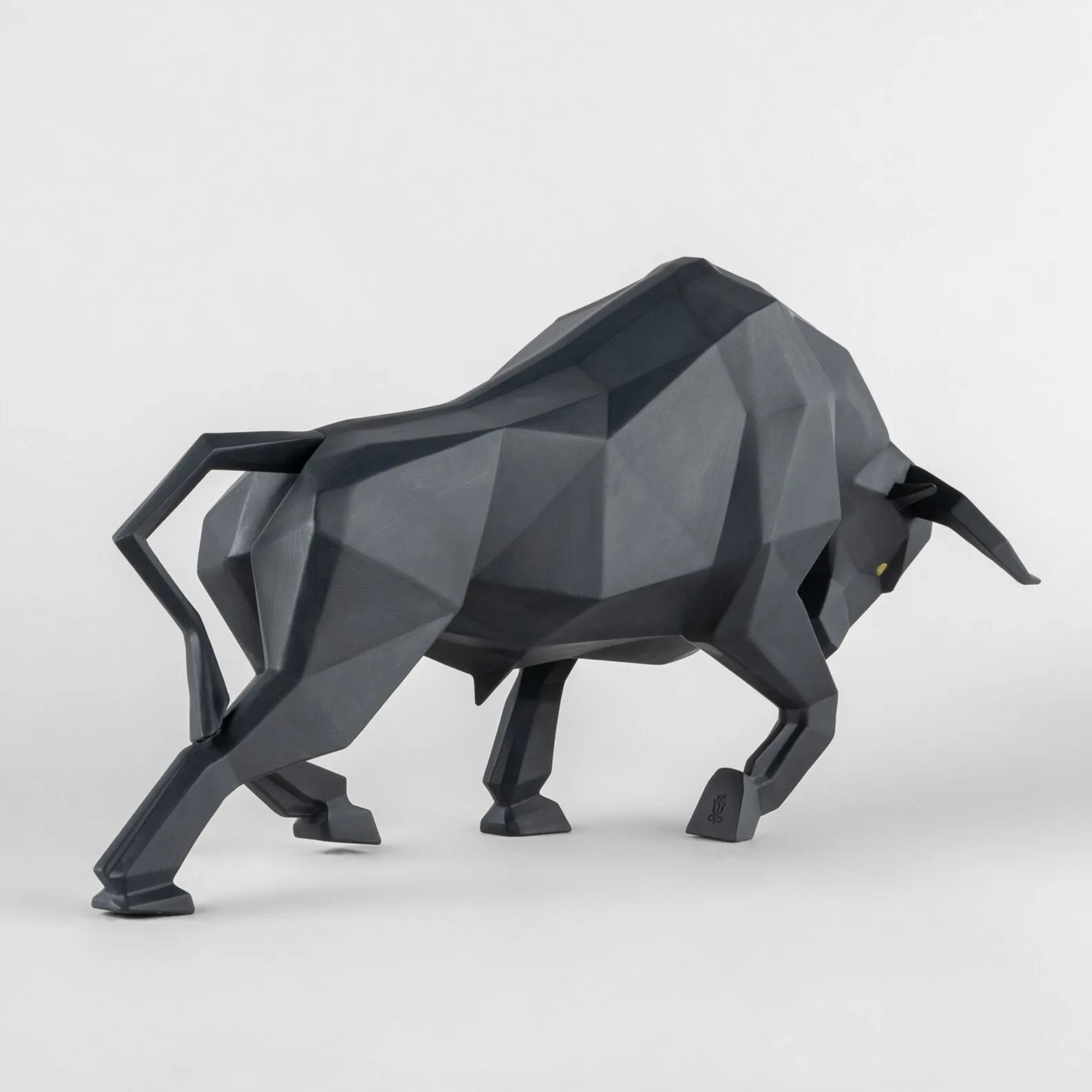 Scultura Toro Nero Opaco realizzata in porcellana. Tributo alla forma e all’eleganza dell'arte geometrica e concettuale, questa scultura è impreziosita dal singolare dettaglio degli occhi dell'animale, l'unico punto di colore che attira lo sguardo ed enfatizza l'anima vivace dell'opera. Aggiungi un tocco di sofisticata audacia alla tua collezione d'arte o concedi uno spazio di rilievo a questo toro Origami all'interno del tuo ambiente, per un impatto visivo inconfondibile.