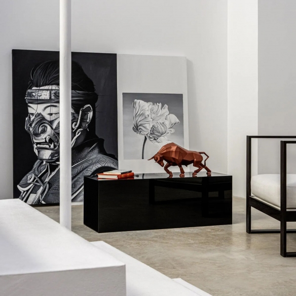 Scultura Toro Rosso Metallizzato realizzata in porcellana. Questo pezzo unico rappresenta un toro, simbolo di forza e coraggio, splendidamente decorato in un rosso metallizzato che ne esalta le forme geometriche e i dettagli concettuali. Perfetta armonia di colore e design, questa scultura cattura l'attenzione in ogni spazio, aggiungendo un tocco di eleganza contemporanea e vibrante. Ideale per gli amanti dell'arte moderna e per chi desidera aggiungere una nota di colore audace e sofisticato alla propria collezione o ambiente.