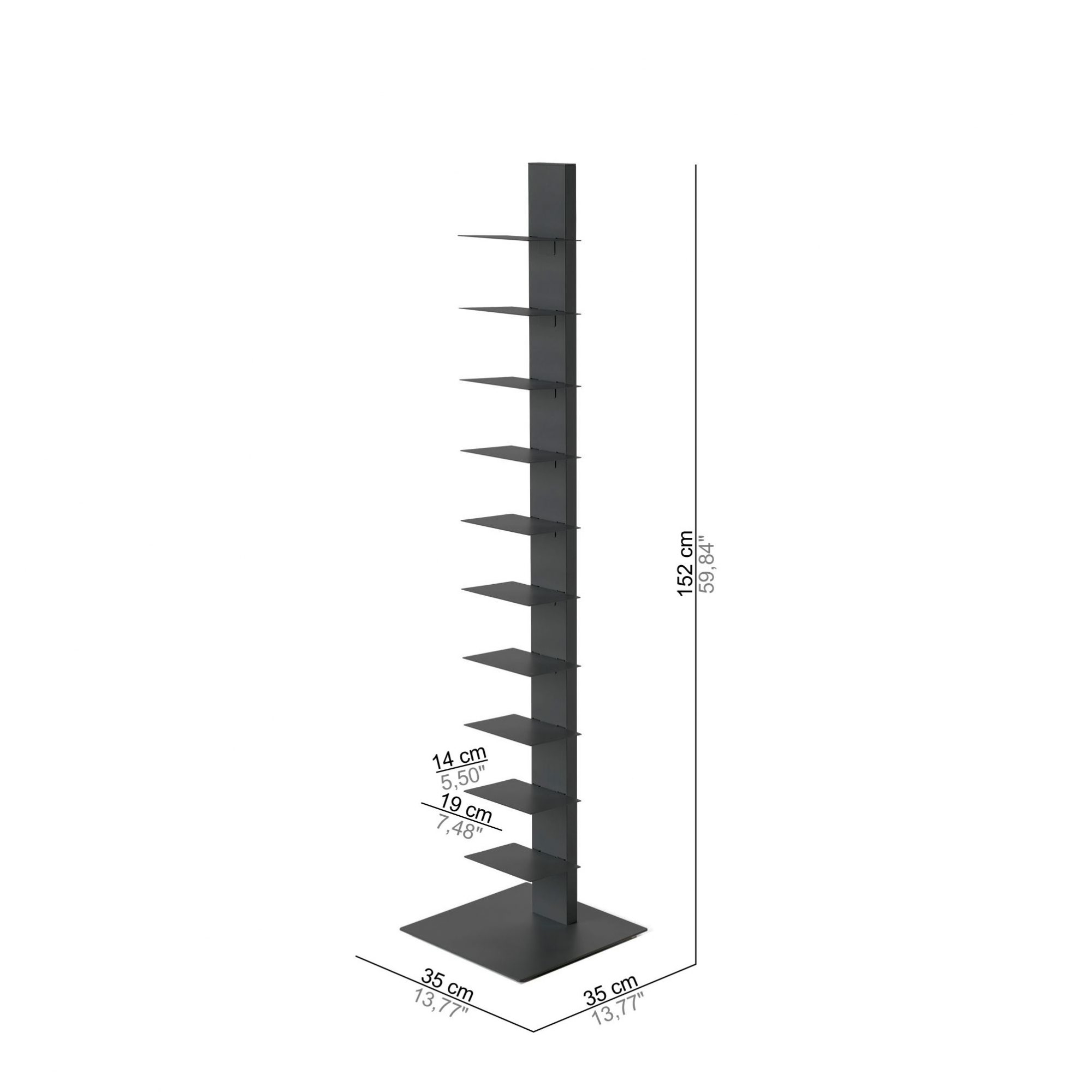 Libreria verticale Sapiens alta 152 cm realizzata in acciaio verniciato a polveri epossidiche. Una libreria iconica: inimitabile nel design, nella funzionalità e nell'estetica. La particolarità di questa libreria è che appoggiando orizzontalmente i libri sulle 10 mensole, si fa scomparire la struttura stessa della libreria ottenendo una fantastica colonna sospesa di libri! La libreria Sapiens è molto facile da montare ed occupa pochissimo spazio, sistemala in soggiorno, in camera da letto o in qualsiasi spazio tu voglia, anche di dimensioni ridotte. La libreria Sapiens è disponibile in 7 finiture di colore; scegli il tuo preferito e personalizza la tua libreria Sapiens! Disegnata da Bruno Rainaldi per BBB Italia.