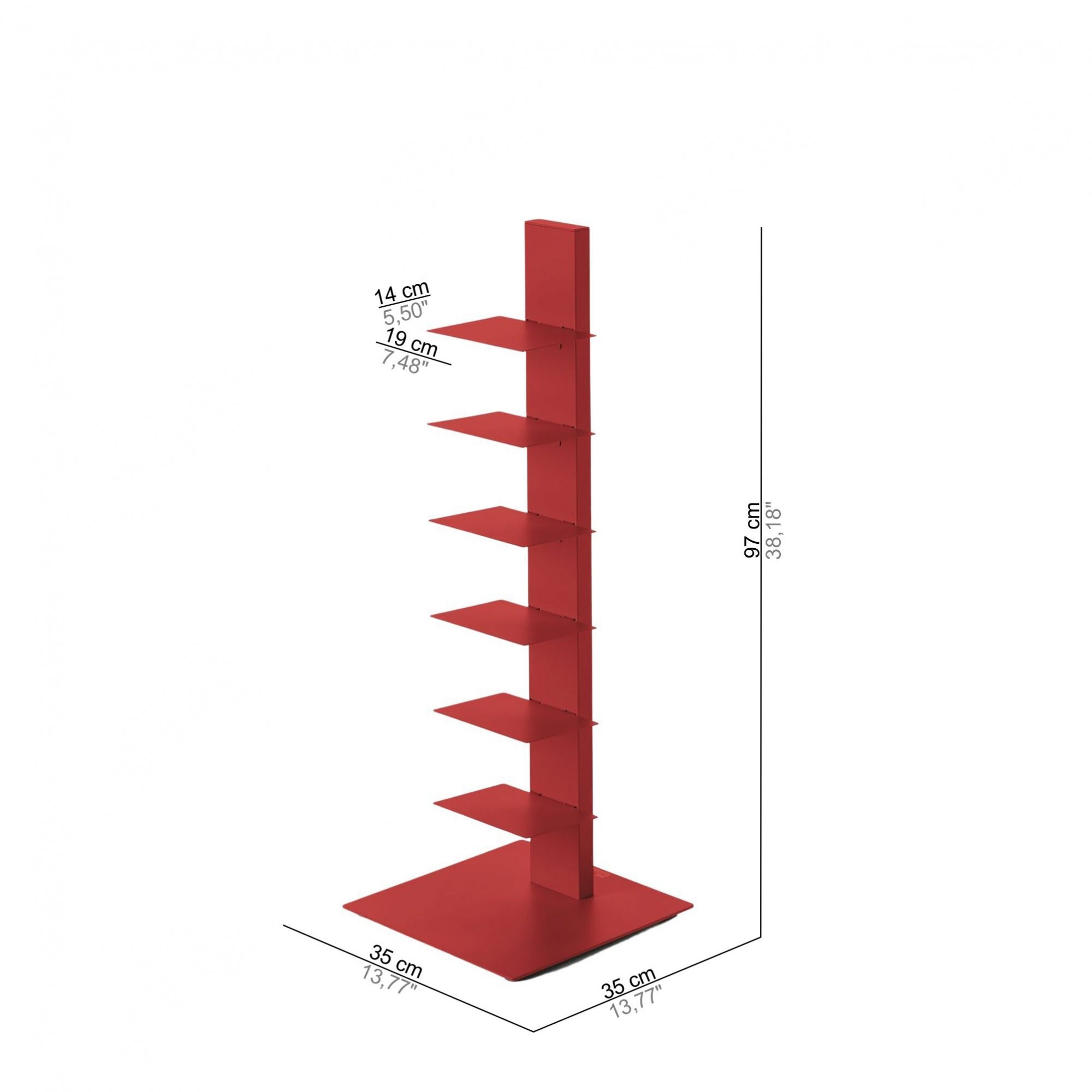 Libreria verticale Sapiens alta 97 cm realizzata in acciaio verniciato a polveri epossidiche. Una libreria iconica: inimitabile nel design, nella funzionalità e nell'estetica. La particolarità di questa libreria è che appoggiando orizzontalmente i libri sulle 6 mensole, si fa scomparire la struttura stessa della libreria ottenendo una fantastica colonna sospesa di libri! La libreria Sapiens è molto facile da montare ed occupa pochissimo spazio, sistemala in soggiorno, in camera da letto o in qualsiasi spazio tu voglia, anche di dimensioni ridotte. La libreria Sapiens è disponibile in 7 finiture di colore; scegli il tuo preferito e personalizza la tua libreria Sapiens! Disegnata da Bruno Rainaldi per BBB Italia.