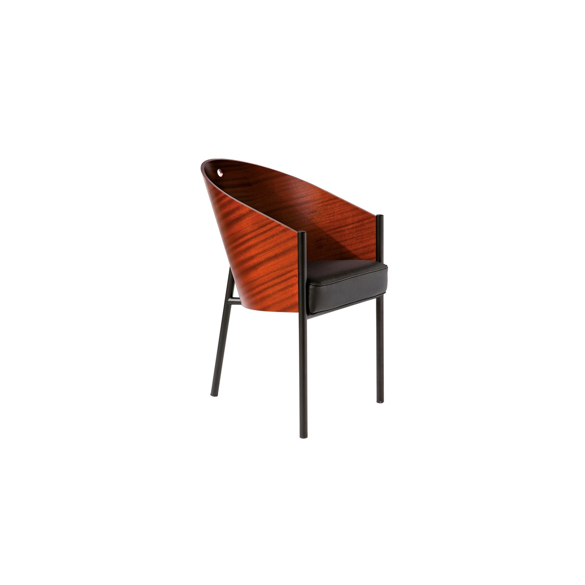 Poltroncina con struttura tubolare in acciaio verniciato di colore nero, scocca in multistrato curvato con finitura in mogano, mogano ebanizzato, rovere, grigio, wengè rigato o bamboo. Imbottitura in schiuma poliuretanica.Disegnato da Philippe Starck per Driade.