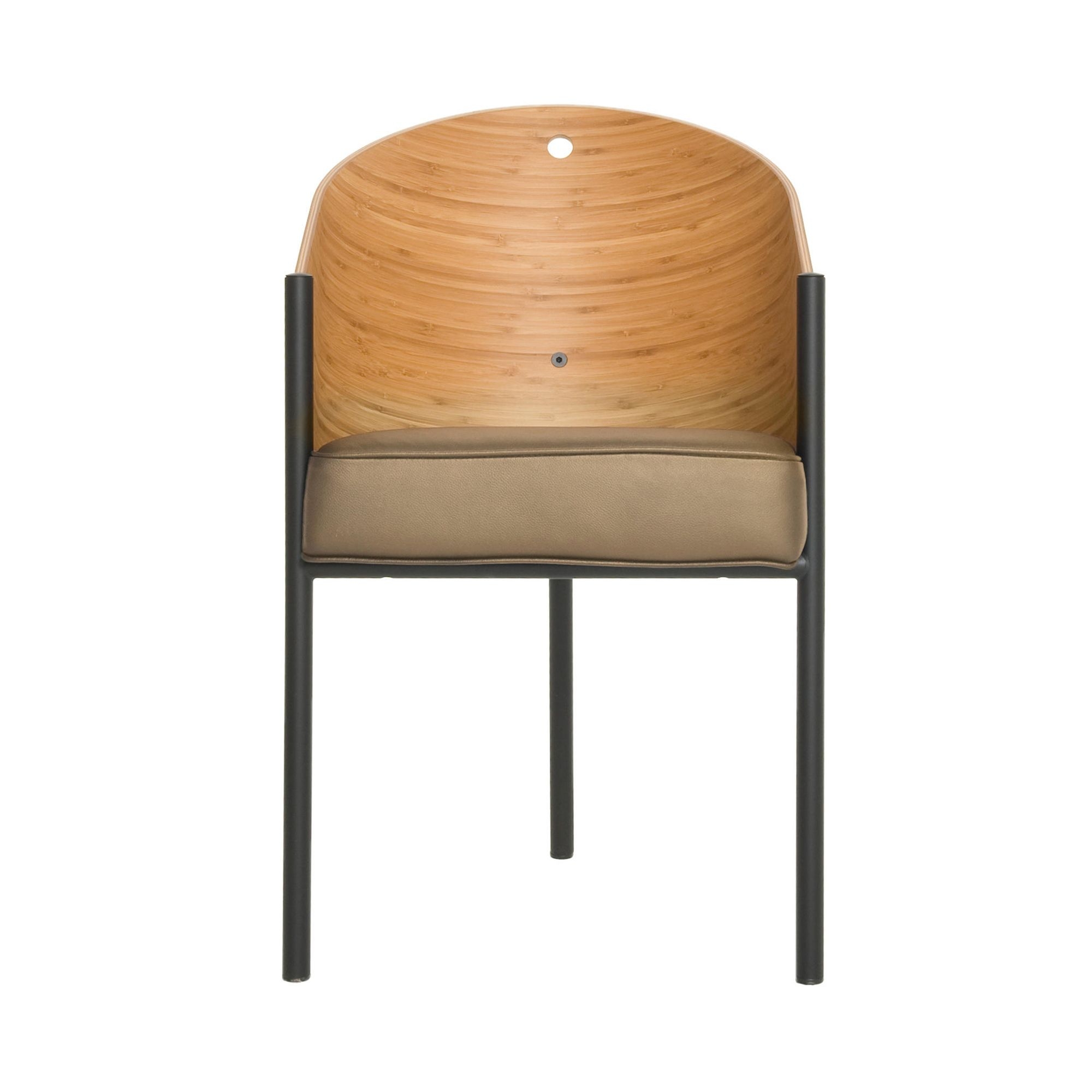 Poltroncina Costes realizzata con struttura in tubolare di acciaio verniciato di colore nero, scocca in multistrato curvato in wengè o bamboo e imbottitura Imbottitura in schiume poliuretaniche con rivestimento fisso in pelle nera o in pelle chiara. Vera e propria icona del brand Driade, Costes è una poltroncina da interni dotata di grande eleganza e allo stesso tempo grande comodità. Ideale sia per arredamenti domestici sia per luoghi pubblici, Costes prende il nome dall'omonimo caffè parigino, oggi scomparso. Disegnata da Philippe Starck per Driade.