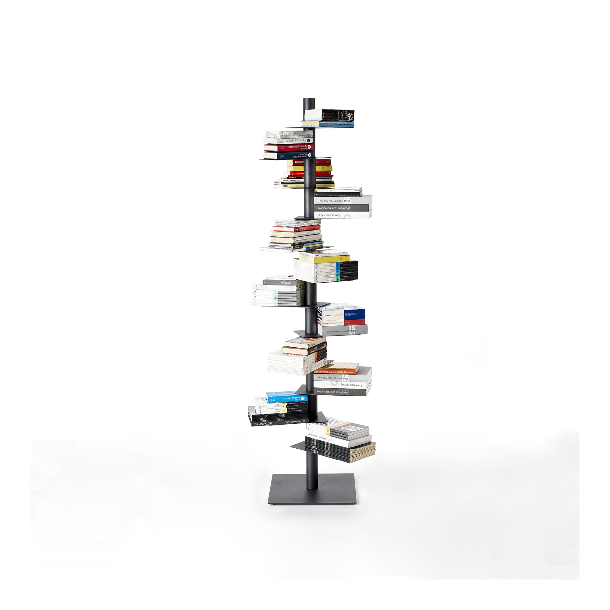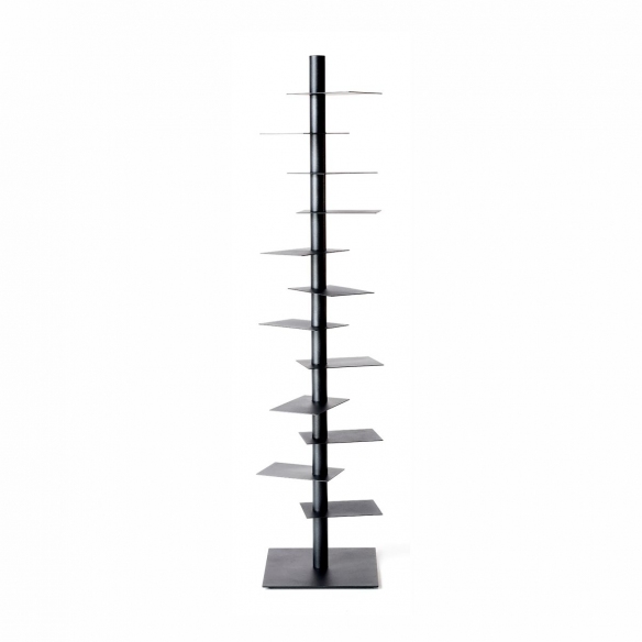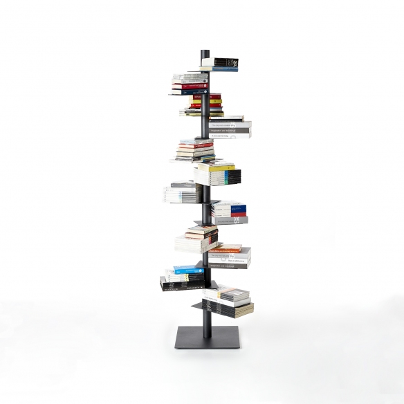 Libreria in lamiera metallica, formata da un montante a sezione circolare dal diametro di 6 cm, con 12 ripiani rotanti indipendentemente a 360°, disegnata da Michele Franzina per BBB Italia