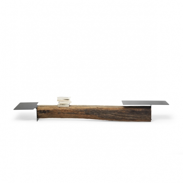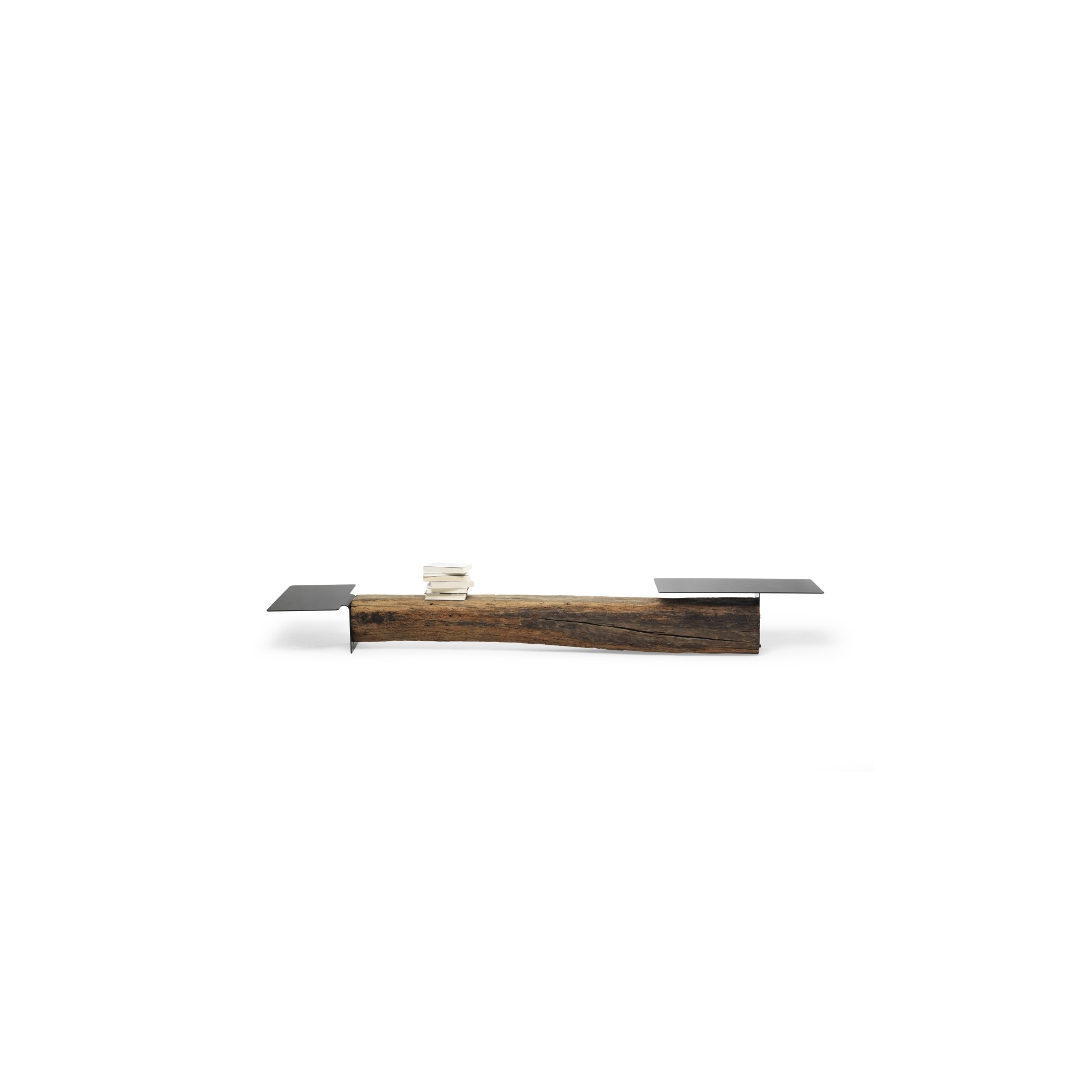 Tavolino Beam Side Table realizzato in legno con ripiano in metallo. Questo tavolino è perfetto per ogni ambiente e la trave in rovere antico ha un aspetto rustico, appositamente scelto per sfruttare a pieno il valore espressivo. La sua funzionalità è data dal ripiano in metallo, verniciato in piombo in cui si possono appoggiare rivista, tazze e molto altro. Inoltre la sua lunghezza di 220 cm perette di appoggiare comodamente la televisione. Beam è il tavolo perfetto per chi vuole portare un pezzo di foresta nel suo arredamento. Disegnato da Damien Gernay per Mogg.
