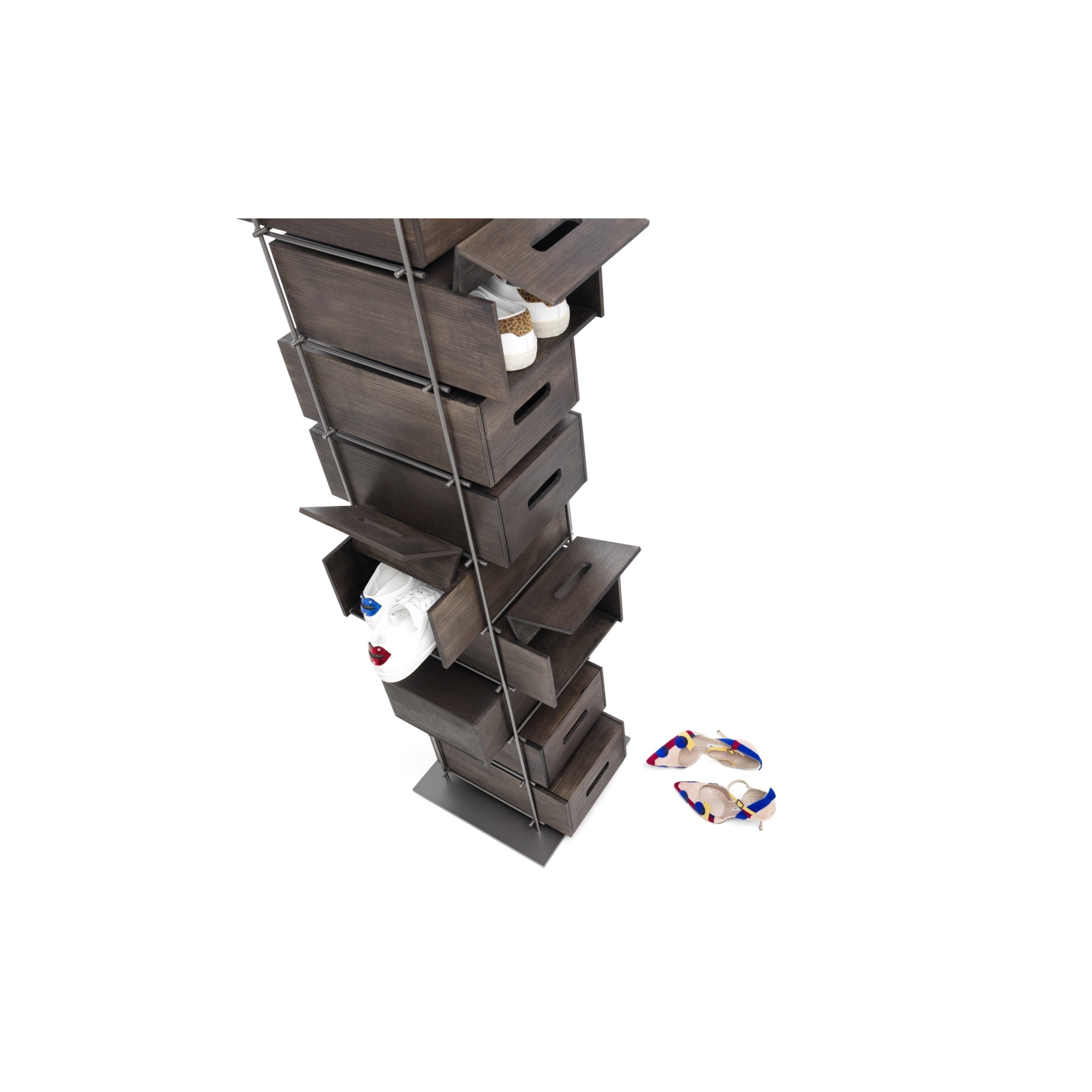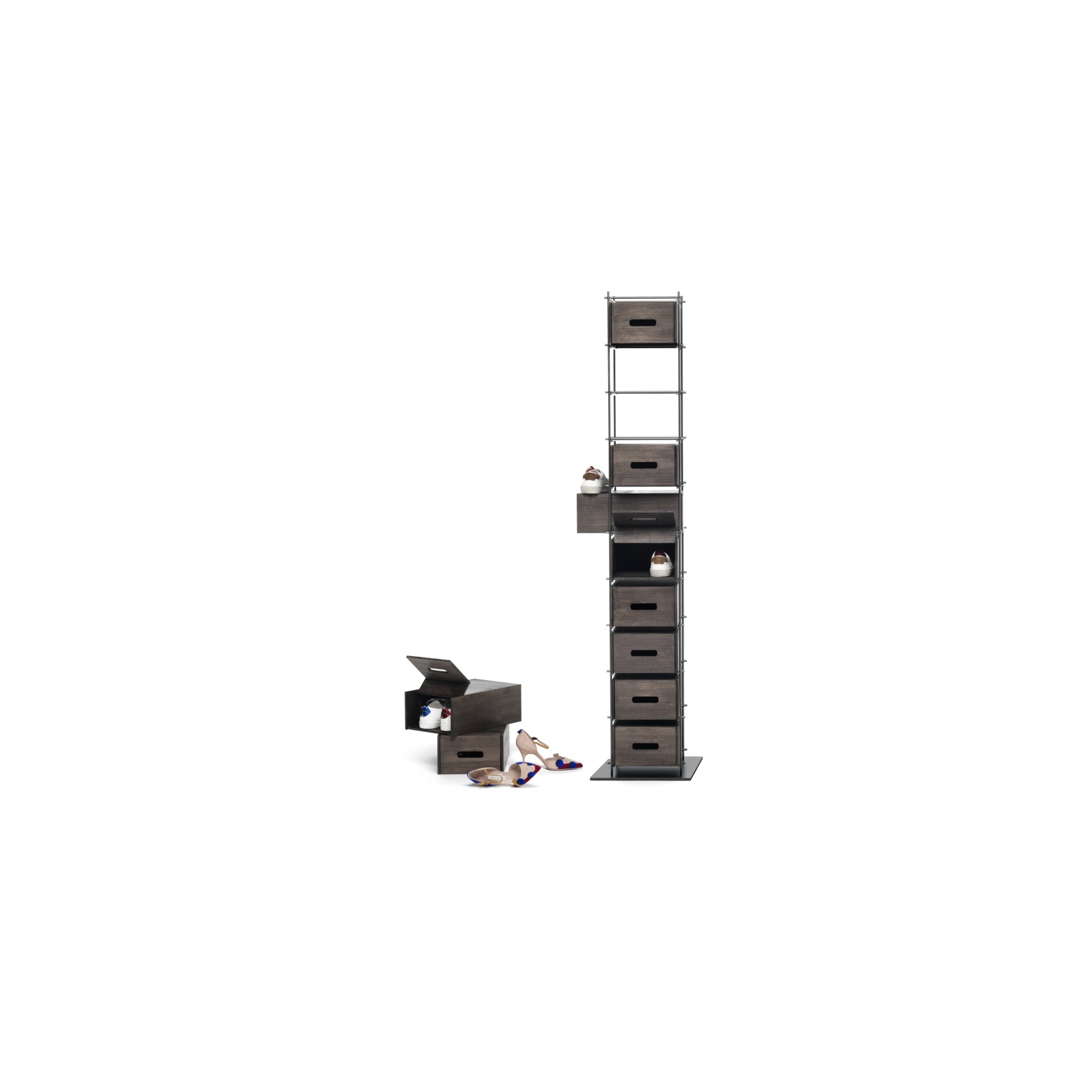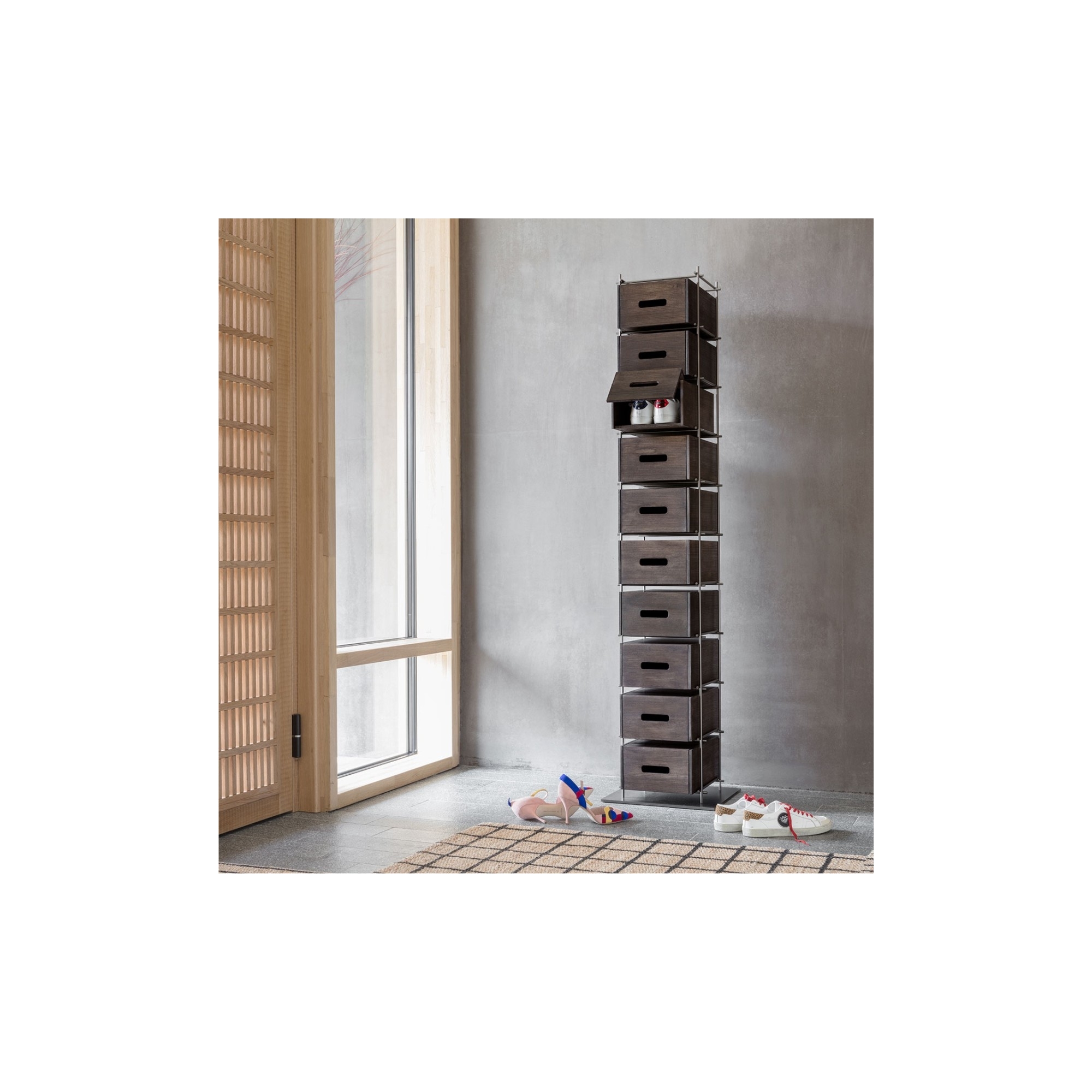 Mogg Scarpiera Manolo realizzata in metallo in finitura brunita con contenitori in legno di frassino tinto di moka. Manolo nasce dall’esigenza di dare dignità ad un prodotto ritenuto sempre secondario e povero. Il designer crea un nuovo concetto di scarpiera, un prodotto stiloso e funzionale. Finalmente una scarpiera che non si deve nascondere ma che vuole essere esibita nell’ambiente domestico. Disegnato da Idelfonso Colombo per Mogg.