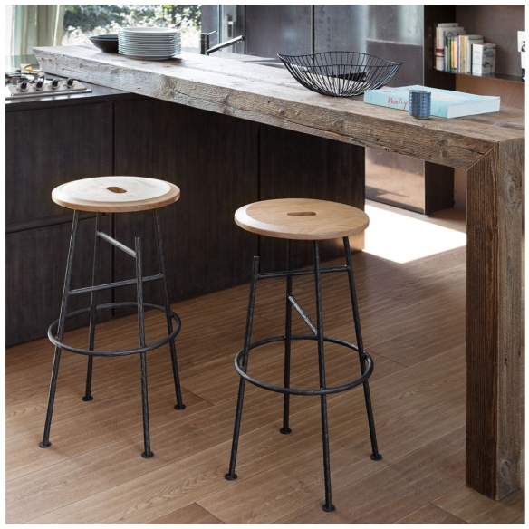 Sgabello Sbagliato realizzato in ferro battuto con seduta in massello di noce Canaletto. La struttura in ferro presenta un taglio in una gamba e ciò lo rende funzionale per appoggiare borse o giacche. La seduta in legno, invece, grazie all’incavatura, risulta essere veramente comoda, a differenza di altri sgabelli. Disegnato da NÆSSI STUDIO per Mogg.