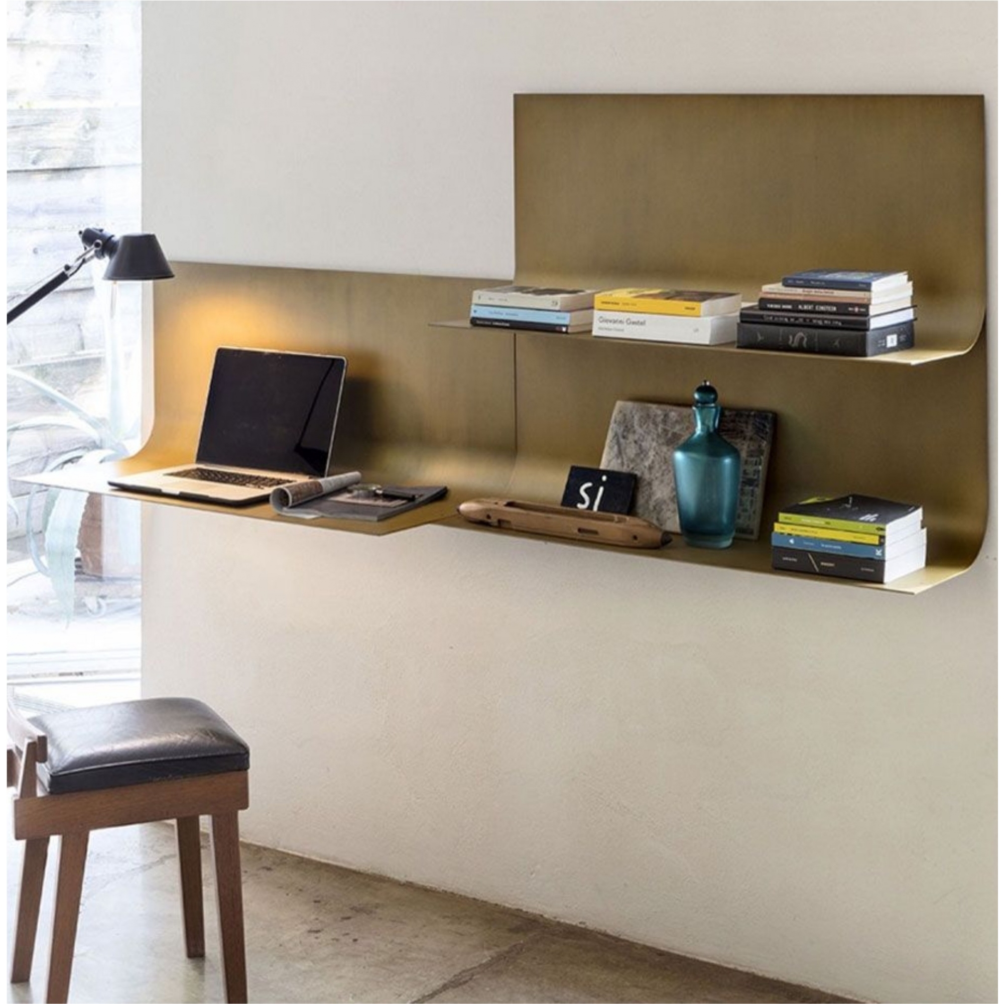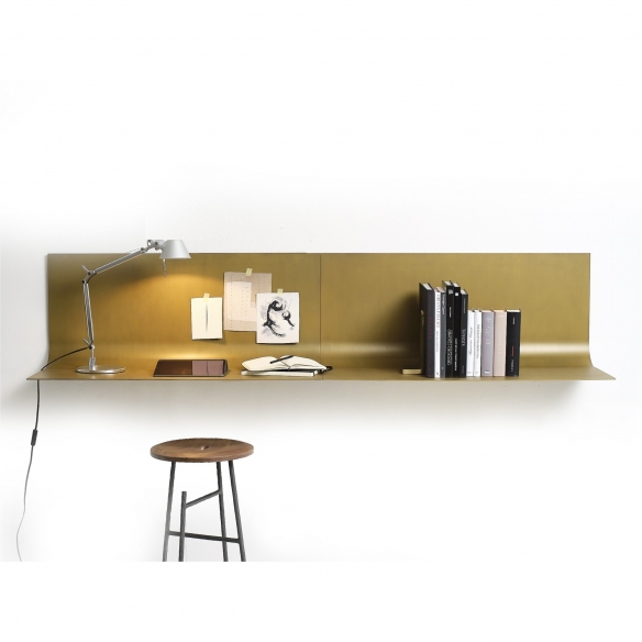 Mensola scrittoio in metallo Sfoglia predisposta per fissaggio a parete. Disponibile in 2 finiture: brunita e bronzo patinato. Sfoglia si presenta come una sottile falda in metallo che, come le pagine di un libro si sfogliano dalla parete. Il risultato è uno strumento sostanzialmente molto semplice ma estremamente duttile. Con un solo modulo è possibile ottenere diverse combinazioni, in modo da poterlo utilizzare per diverse funzioni in diversi ambienti. Un pezzo unico dal design semplice e funzionale, disegnato da Bellavista Piccini per Mogg.