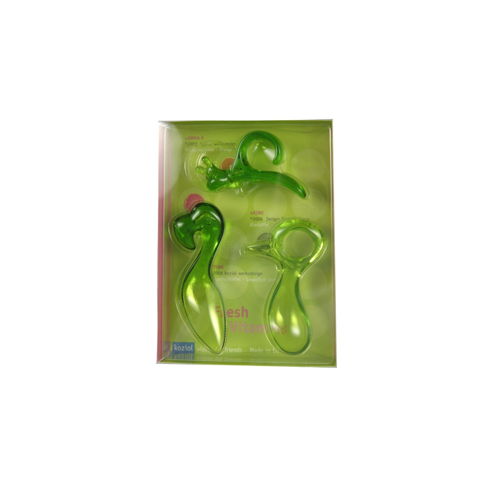 Set di accessori intelligenti, Fresh vitamins di Koziol è stato ideato per facilitare la degustazione del vostro frutto preferito. Grazie ad Emma P, che permette di togliere la scorza senza far schizzi, mantenendo intatto il frutto, al cucchiaio Pink che invece è adatto per il pompelmo, per separare facilmente gli spicchi grazie ai speciali bordi dentellati, e infine grazie a Kiwi il cucchiaio 2in1,con il becco dell'animale che rappresenta con cui rimuovete la buccia e il cucchiaio con cui ne mangiate la polpa.