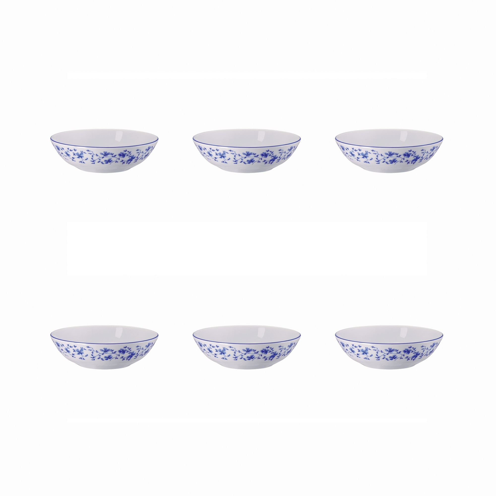 6 coppette Form 1382 Blaublüten realizzate in porcellana decorata. Eleganti e raffinate, queste coppette da 16 cm sono perfette per servire dessert, antipasti o contorni. Che sia per un uso quotidiano o per eleganti cene, diventano le protagoniste indiscusse, aggiungendo un tocco di classe indimenticabile ad ogni pasto. La cura dei dettagli e la raffinatezza dei materiali fanno delle 6 coppette Form 1382 un investimento di lunga durata nella bellezza e nella funzionalità. Realizzate da Rosenthal.