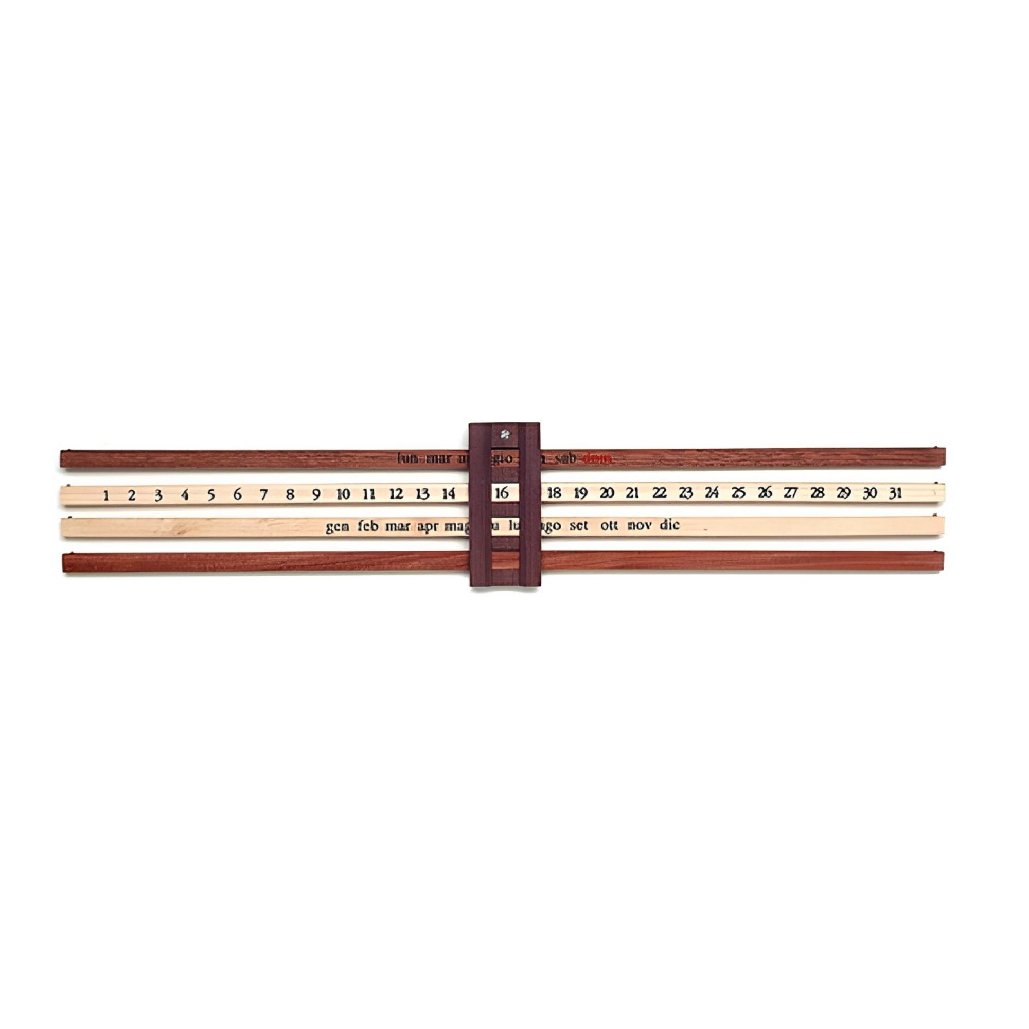 Calendario Bilancia realizzato in legno. Molto particolare e suggestivo, Bilancia è un calendario che pone il suo funzionamento sul movimento e sulla gestualità del passare del tempo. Bilancia consiste in un perno centrale in legno dove scorrono dolcemente quattro bacchette con un movimento orizzontale. Ogni lista ha giorni, mesi e numeri stampati in serigrafia. L'intera struttura gioca sull'equilibrio delle singole asticine in legno, rivisitando la classica funzione della bilancia assegnandole quella di calendario. Disegnato da Enzo Mari nel 1959 per Danese Milano.
