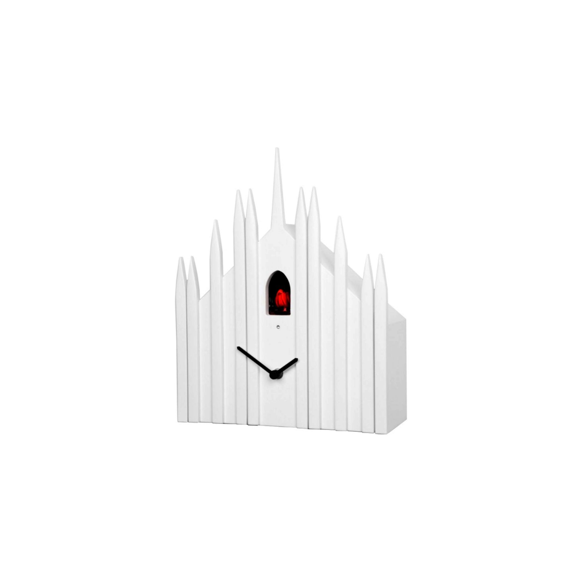 Duomo è l'orologio a cucù disegnato nel 2012 da Luca Trazzi per il brand Diamantini & Domeniconi. Presentato alla Milano Design Week 2014, questo particolare orologio riproduce la sagoma stilizzata del Duomo di Milano ed è ispirato al più importante simbolo della città metropolitana, capitale del fashion e del design. Proprio un oggetto d'alto design è ciò che rappresenta il cucù, prodotto da una delle poche aziende oramai rimaste che svolge rigorosamente con orgoglio l'intero processo produttivo interamente in Italia. Il risultato di tale lavoro creativo è un oggetto bello da vedere ma anche, e soprattutto, di altissima qualità che rende omaggio non solo al celebre monumento ma anche al classico sistema a cucù. La cassa dell'orologio a cucù Duomo è realizzata in legno MDF laccato in vernice mentre le lancette sono in acciaio. Sul fronte al centro, come a voler accennare il finestrone centrale della cattedrale, una piccola finestra ospita l'uccellino che allo scoccare di ogni ora intonerà il suo "cucù" tante volte fino all'ora esatta. Con il sensore di controllo luce l'uccellino non uscirà quando le luci saranno spente, puoi dormire sogni tranquilli! Duomo è perfetto in ogni ambiente e può essere appeso o appoggiato. Per iniziativa dello stesso Luca Trazzi, la produzione e la successiva vendita dell'orologio cucù Duomo ha contribuito al progetto di raccolta fondi "Adotta una Guglia", con lo scopo di migliorare l'immagine del noto monumento di Milano in occasione di Expo 2015. Un capolavoro del design Made in Italy da esporre con orgoglio in ogni ambiente della tua casa. Ordina l'orologio a cucù Duomo qui su Newpop.