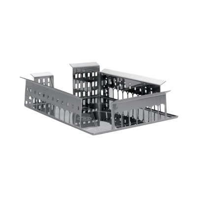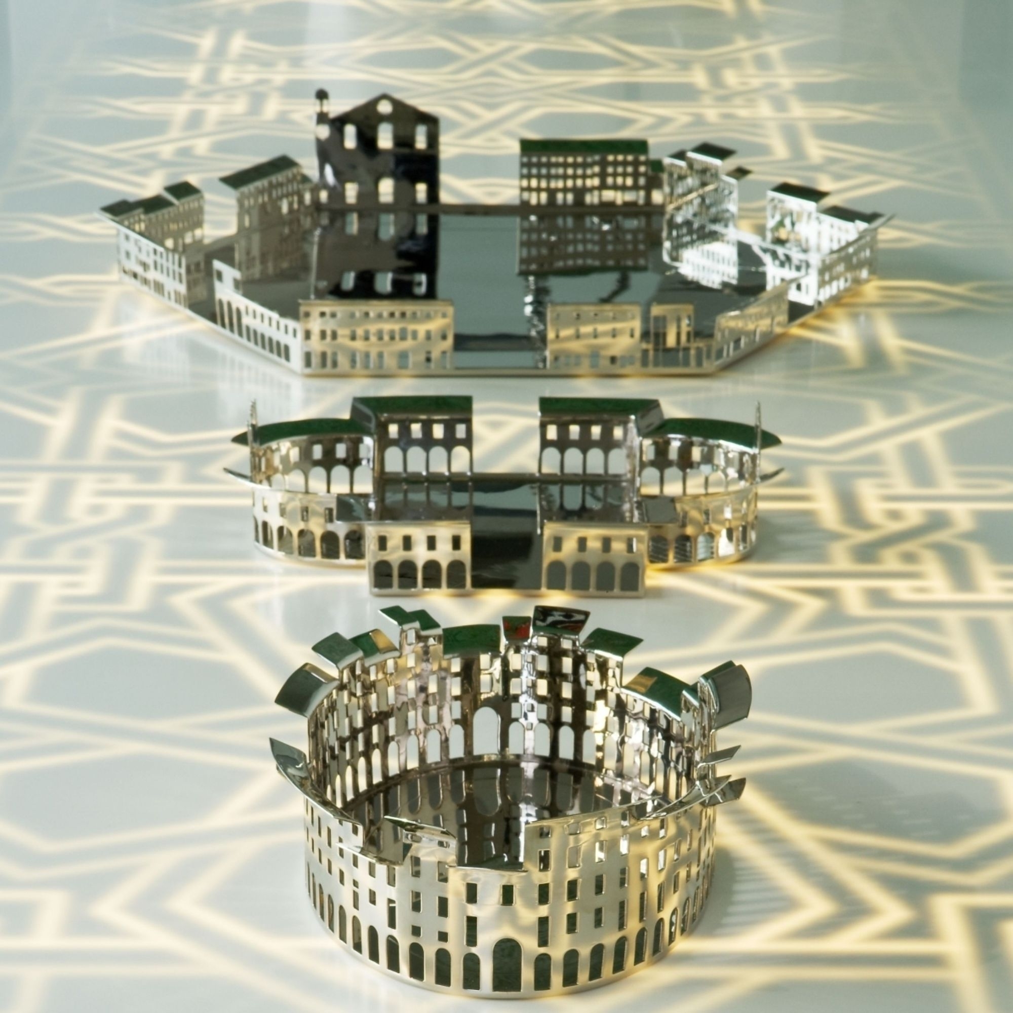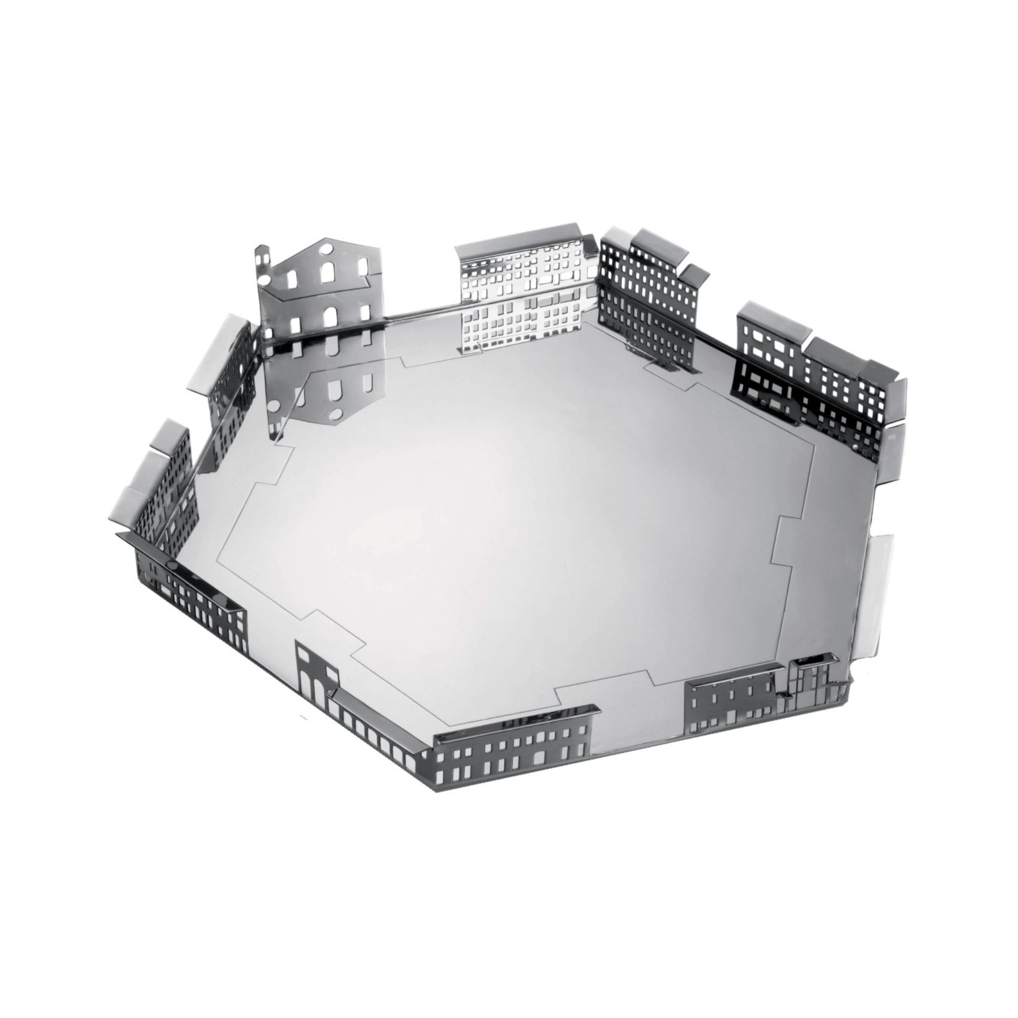 Centrotavola Palmanova Piazza Grande, facente parte della collezione 100 Piazze, realizzato in acciaio. Elegante e imponente, questo centrotavola riproduce esattamente la forma e l'eleganza di piazza Grande a Palmanova, piazza dalla forma esagonale e ricca di storia: la sua costruzione risale al 1593 quando i Veneziani per scongiurare gli attacchi degli Ottomani decisero di costruire una vera e propria città fortezza per difendersi dai saccheggiamenti. Il centrotavola in questione è perfetto per coloro che amano le riproduzioni in scala e vogliono celebrare la grandezza che contraddistingue da sempre la storia italiana. Disegnato da Fabio Novembre per Driade.