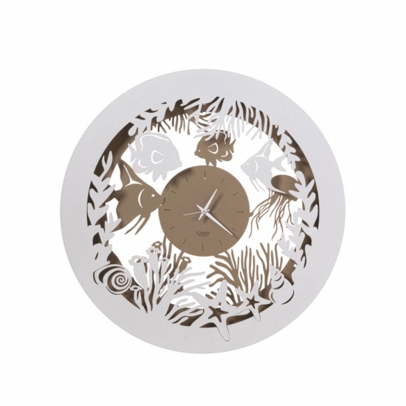 Orologio da parete con numerose decorazioni a tema marino sul quadrante, disponibile in tre combinazioni di colore.