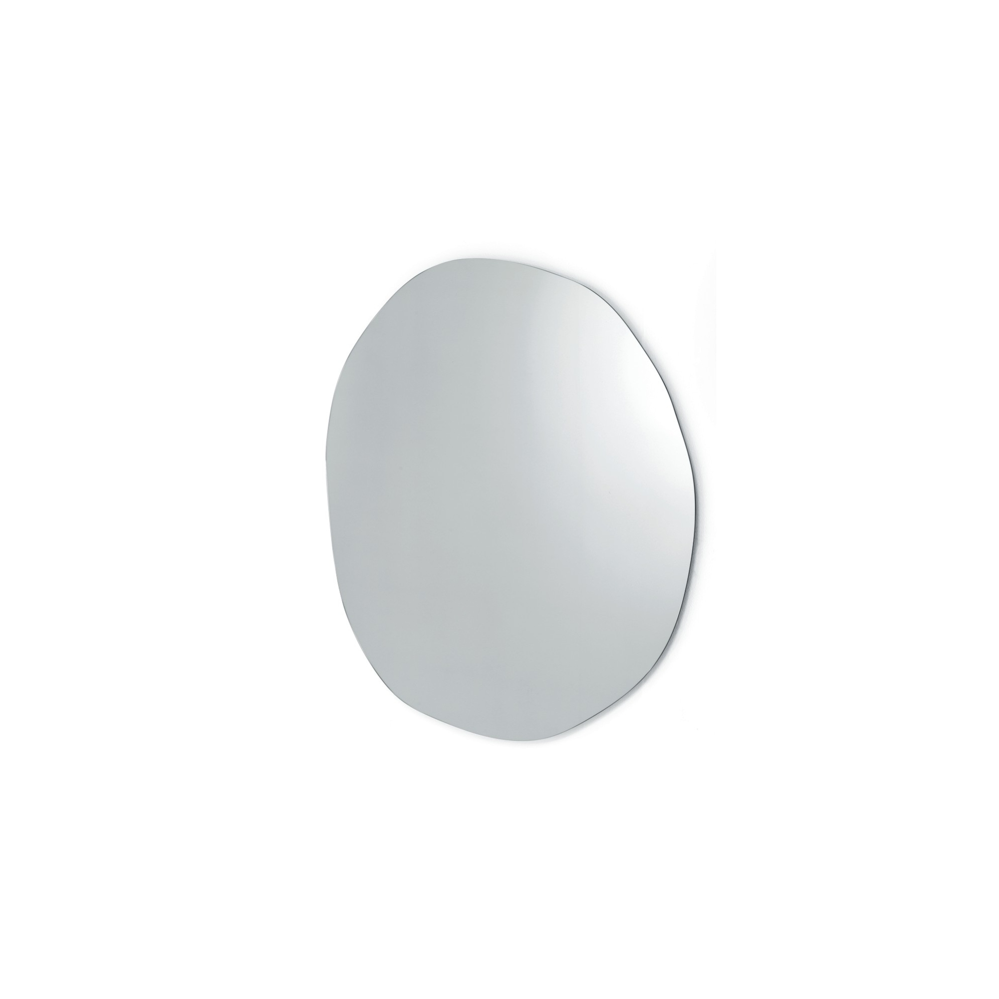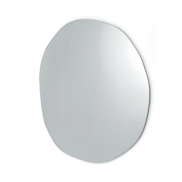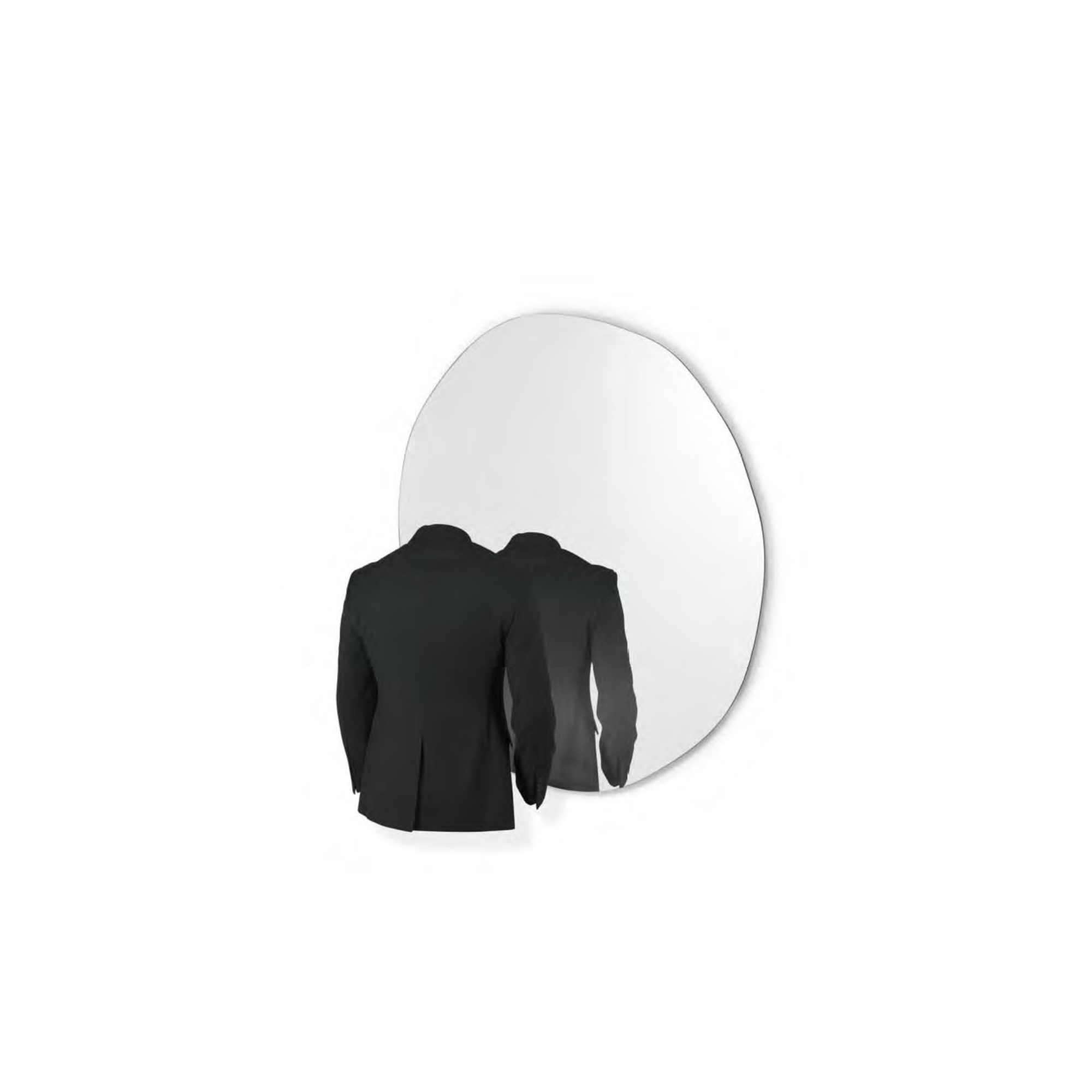 Specchio Giotto realizzato in vetro dal diametro di 135 cm. Giotto è uno specchio da parte circolare, ma il cerchio risulta essere imperfetto. La sua sagoma asimmetrica lo rende un pezzo unico nel suo genere. Disegnato da Kensaku Oshiro per Mogg.