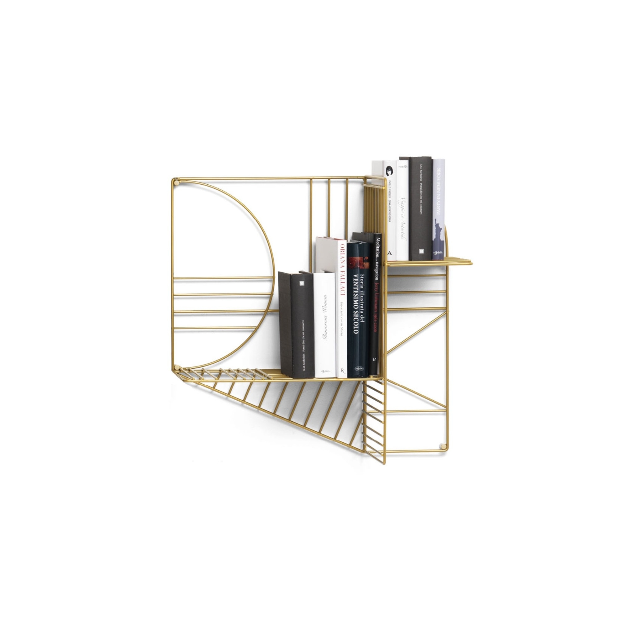 Mensola Musa realizzata in metallo. Musa è la mensola da parete che può essere appesa in 4 posizioni differenti pur rimanendo sempre sé stessa. Disponibile in due finiture diverse, oro o metallo, è costituita da linee metalliche che creano piani, circoscrivono nicchie e determinato un perimetro intorno agli oggetti. Disegnata da NÆSSI STUDIO per Mogg.