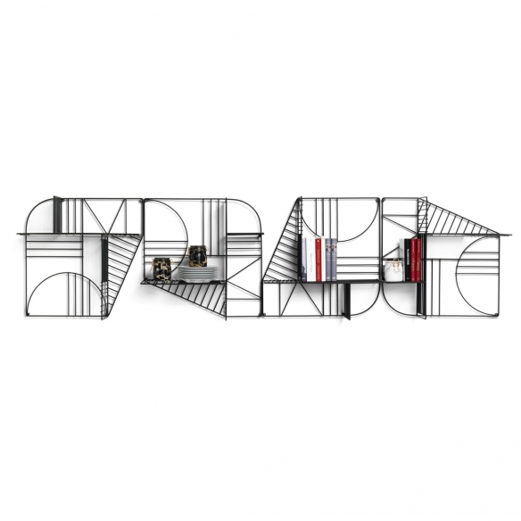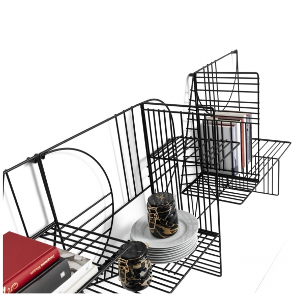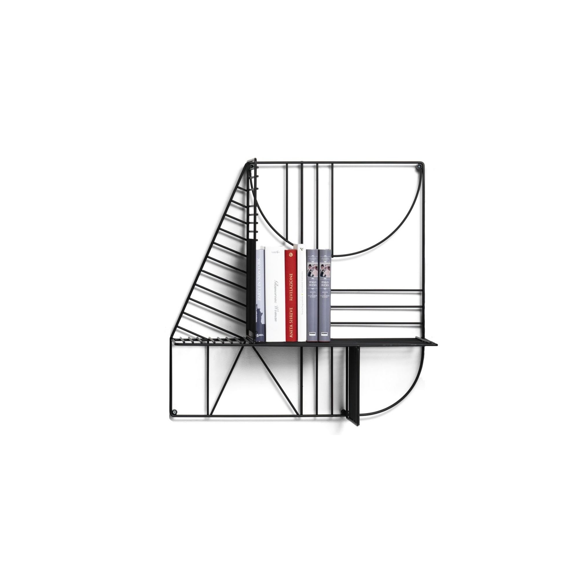 Mensola Musa realizzata in metallo. Musa è la mensola da parete che può essere appesa in 4 posizioni differenti pur rimanendo sempre sé stessa. Disponibile in due finiture diverse, oro o metallo, è costituita da linee metalliche che creano piani, circoscrivono nicchie e determinato un perimetro intorno agli oggetti. Disegnata da NÆSSI STUDIO per Mogg.