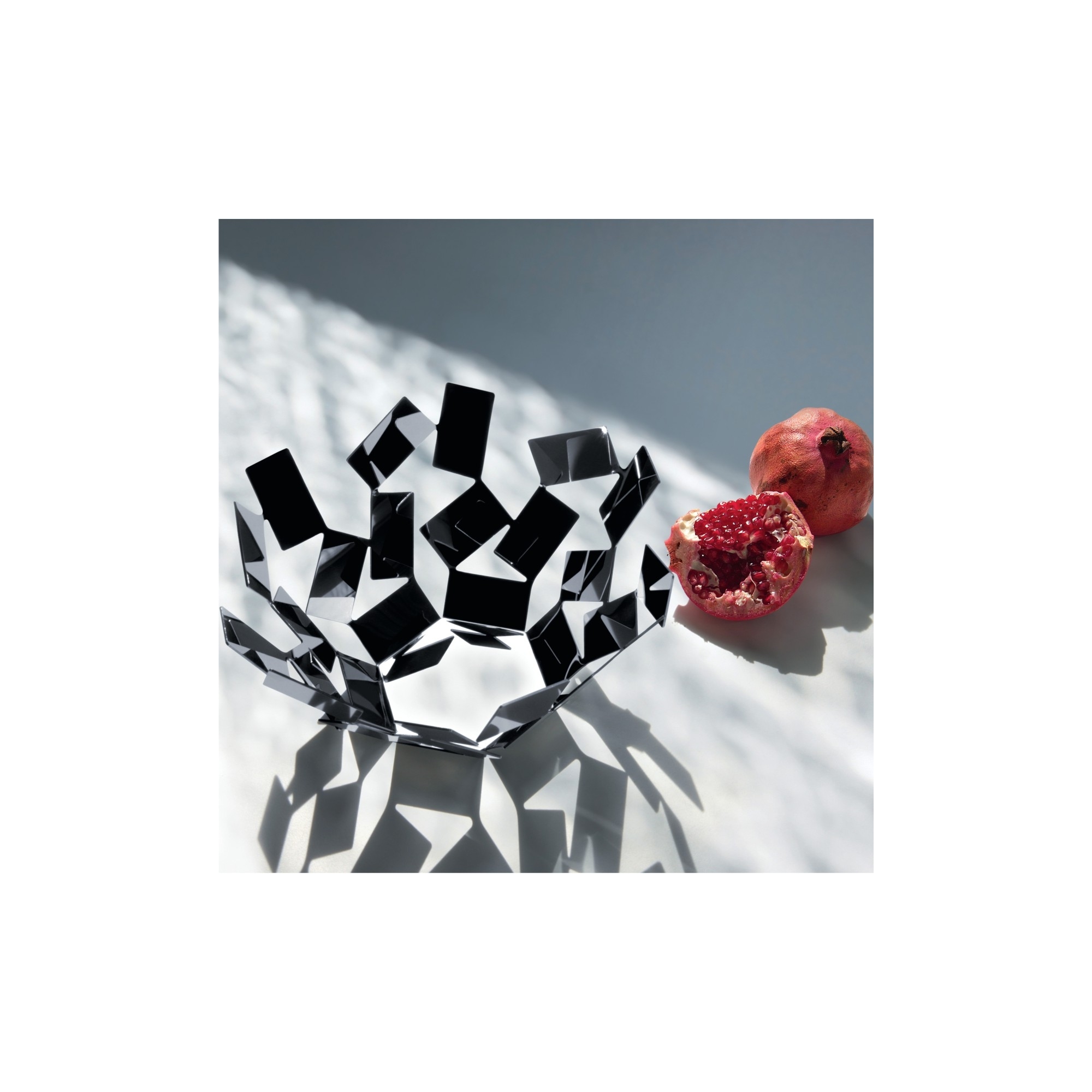 Fruttiera La Stanza dello Scirocco realizzato in acciaio inossidabile 18/10. Questa splendida fruttiera presenta un design estremamente grafico e lineare, caratteristica che permette di paragonarlo ad una vera e propria scultura in cucina. Un mosaico di rettangoli che fluttuano per creare la base di un cestino. Disegnata da Mario Trimarchi per Alessi.