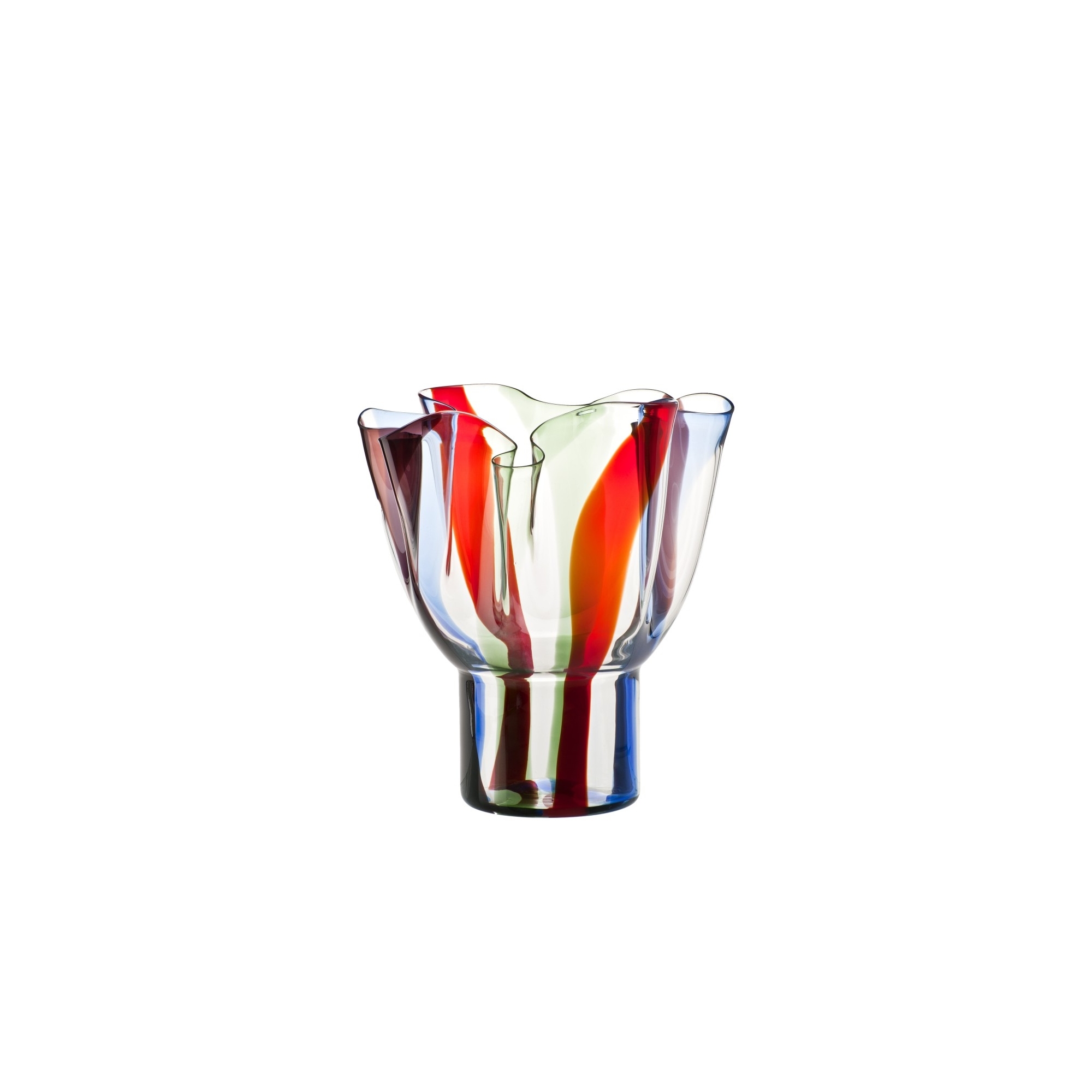 Vaso Kukinto dall'altezza di 40 cm e dal diametro di 46 cm realizzato in vetro soffiato a fasce. Leggero e colorato, il vaso Kukinto sembra voler comunicare un messaggio, grazie al vetro che sembra fluttuare nello spazio accompagnato da colori caldi ma delicati. Il rosso, il verde mela, il blu zaffiro e il nero si incontrano per creare un'armonia di colori affascinante, mettendo in risalto le forme sinuose ed accattivanti di questa opera d'arte. Disegnato da Timo Sarpaneva per Venini.