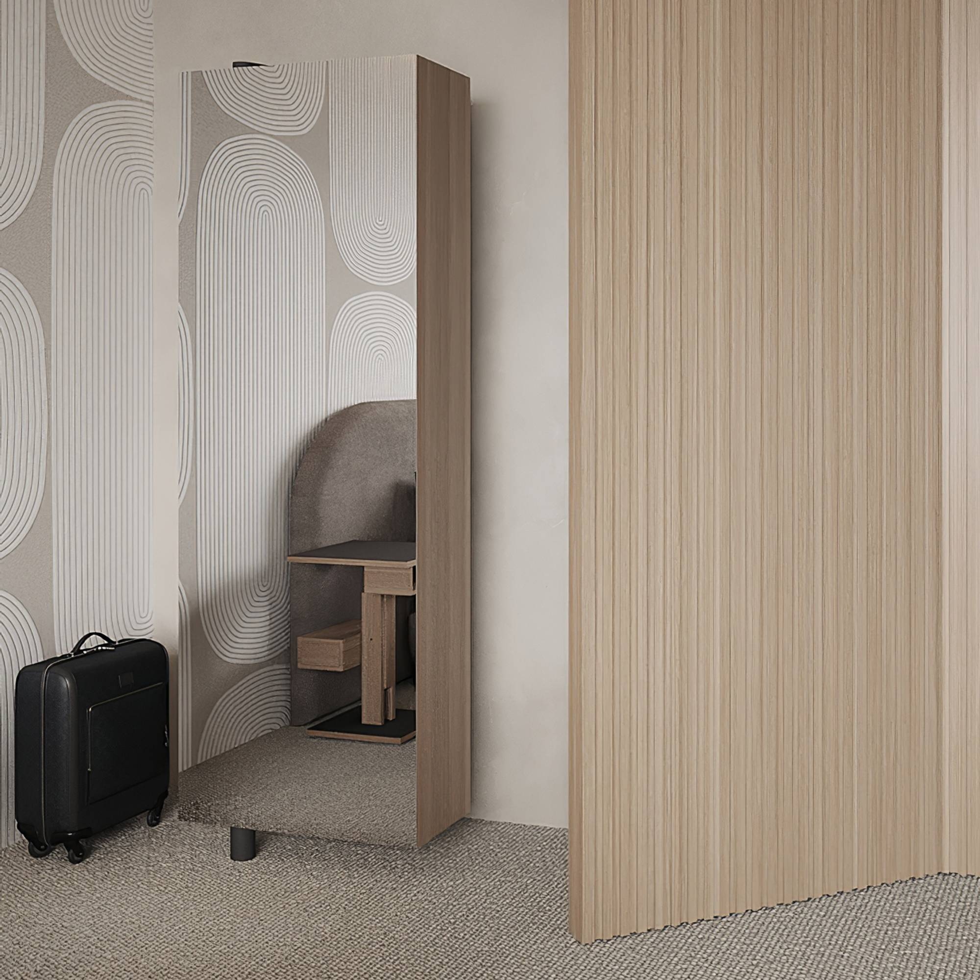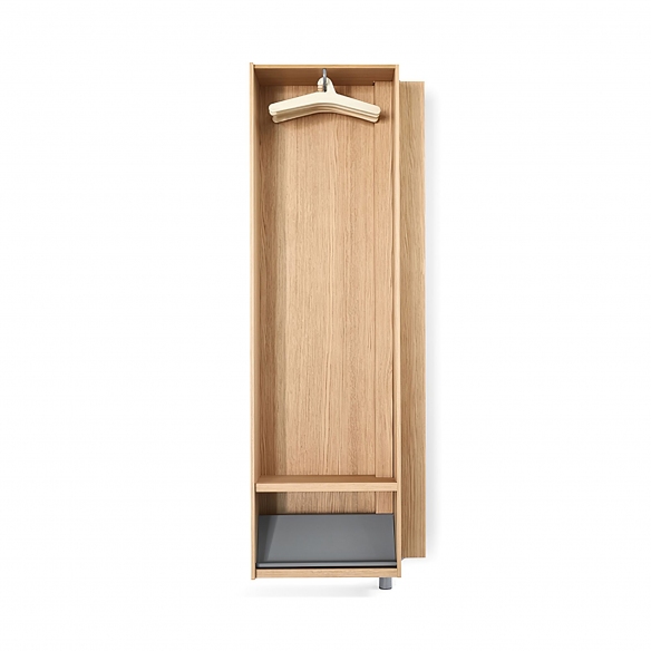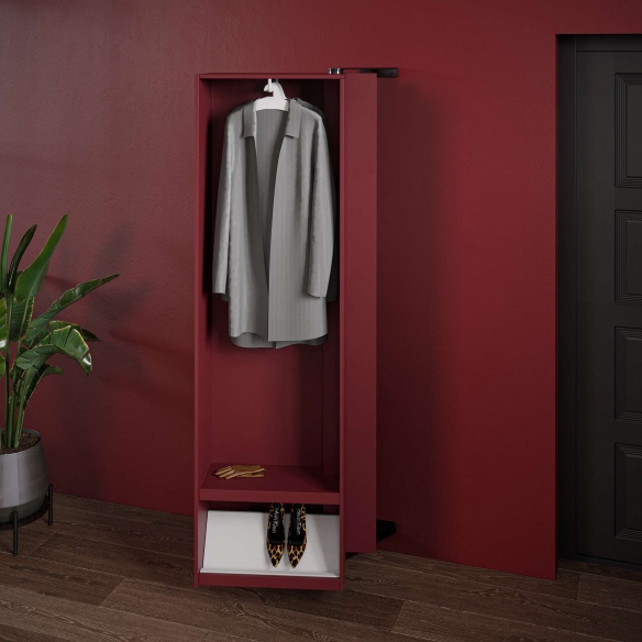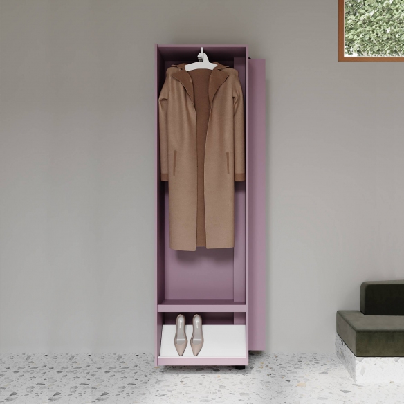 Mobile guardaroba Giralot realizzato con colonna in metallo verniciato a polveri, mensole in metallo verniciato bianco e anta in Touch (laccato) o rovere. Colorato e personalizzabile, il mobile guardaroba Giralot offre in un piccolo spazio, funzionale e divertente, abiti e oggetti sempre ordinati e a portata di mano. È composto da elementi ruotanti a 180°, che si aprono e chiudono con un semplice gesto. Il mobile guardaroba Giralot è dotato di un sistema di grucce in legno, che permettono di appendere i capi in modo pratico e ordinato. Disegnato da Stefano Bettio per Sculptures Jeux.