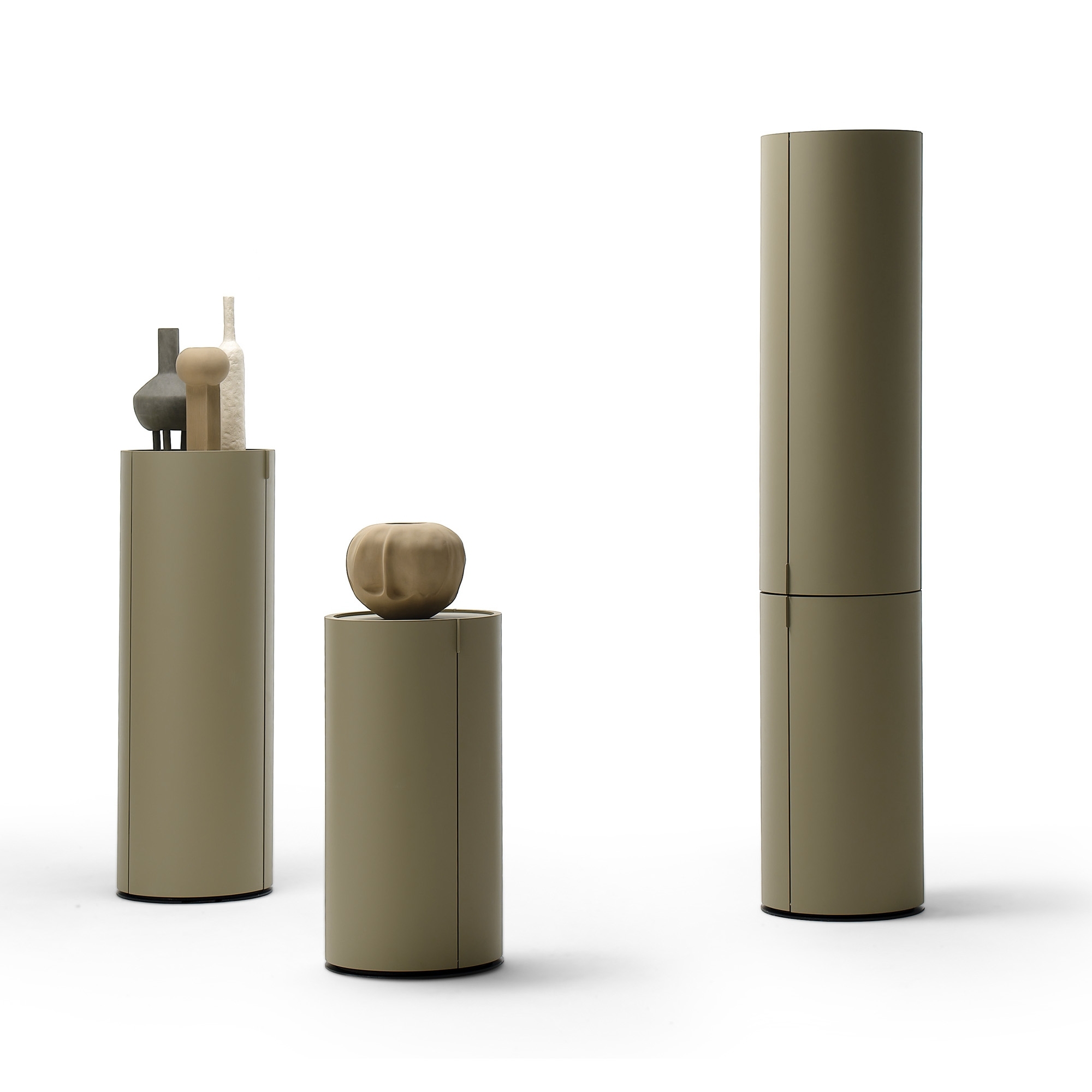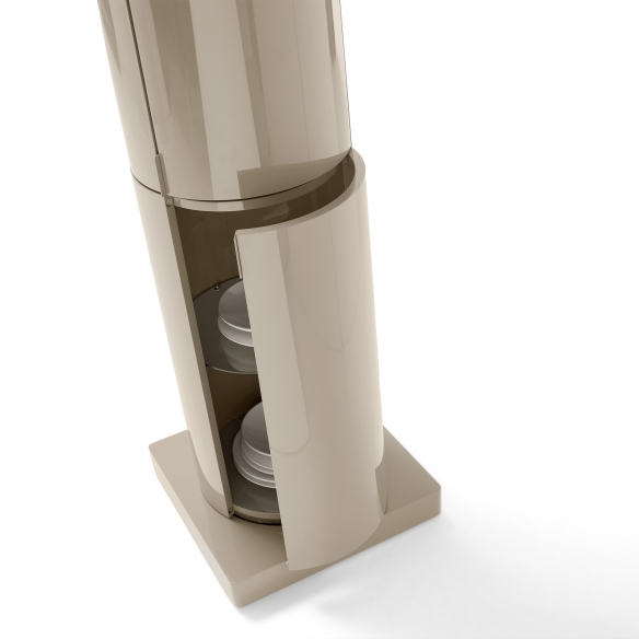 Colonna contenitore La Dori (altezza 122 cm) realizzata in multistrato curvato, completa di 2 ripianI in cristallo. Disponibile laccata goffrato o laccata lucido in 24 colori RAL, La Dori è una colonna contenitore dal design minimale e essenziale, che si distingue per la sua formabilità circolare e la caratteristica di essere priva di appoggi, invitando così a scoprirne il contenuto girando attorno ad essa. La base è realizzata in tamburato laccato in tinta con la colonna, oppure in metallo di colore nero, per un contrasto raffinato o un'affinità stilistica a seconda delle preferenze. La Dori offre ulteriore versatilità grazie alla possibilità di scegliere l'apertura dell'anta sia a destra che a sinistra, ottimizzando l'accessibilità in base alla disposizione degli altri elementi d'arredo e alle esigenze di spazio. Questo elemento distintivo permette di adattare il mobile alle diverse configurazioni del living, rendendolo un pezzo d'arredo altamente funzionale ed esteticamente adattabile. Versatile, sofisticata e funzionale, La Dori rappresenta una soluzione di arredo capace di coniugare eleganza, convenienza e personalizzazione, ideale per arricchire con discrezione e originalità qualsiasi ambiente della casa. Disegnata da Marco Pisati per Mogg.