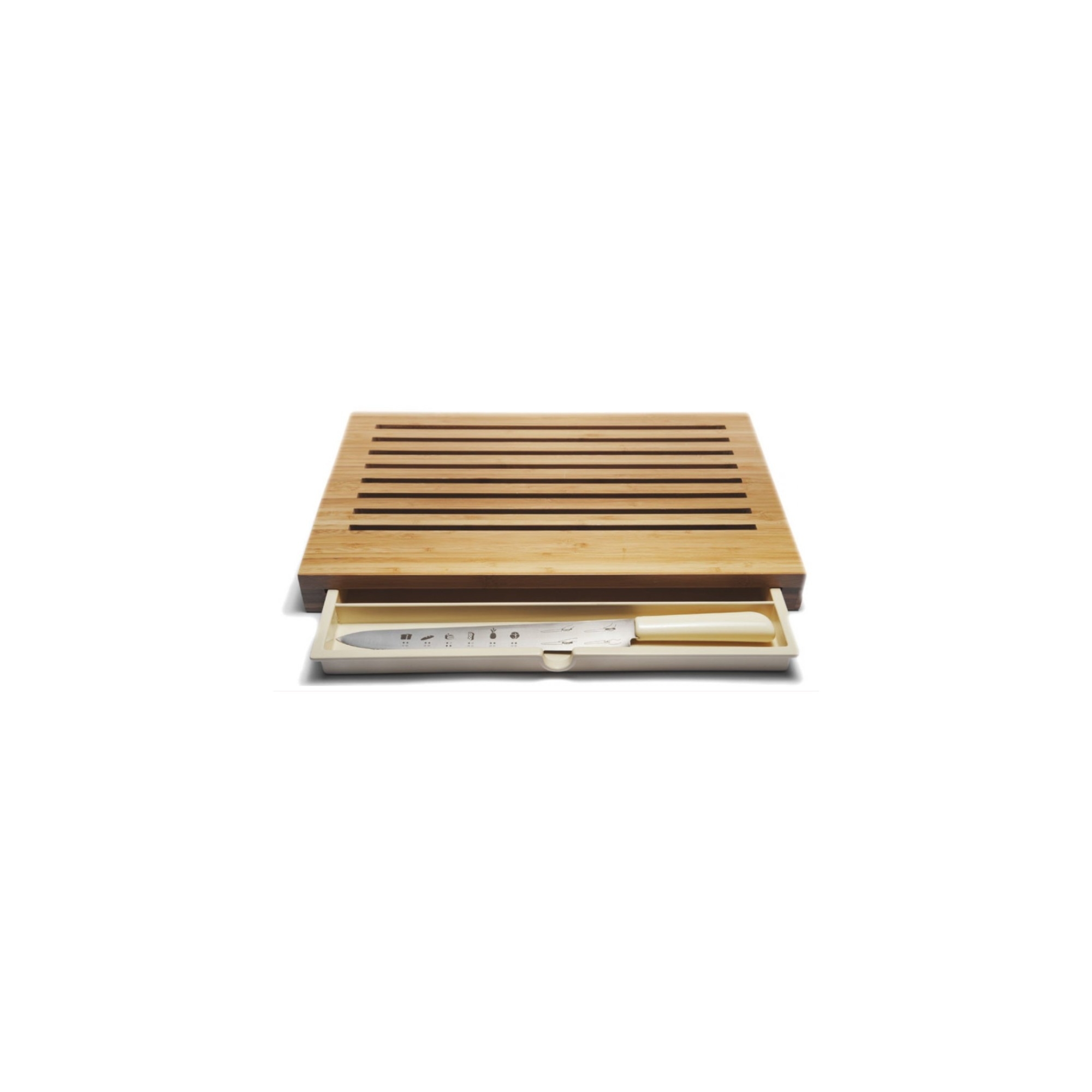 Tagliere per pane Sbriciola realizzato in legno di bambù con raccoglitore in resina termoplastica. Utilizzabile in cucina e non solo, Sbriciola presenta delle larghe fessure longitudinali e un cassettino per raccogliere le briciole che scendono attraverso di esse. Il cassettino è separato in due scomparti, dei quali il più piccolo, che serve per contenere il coltello per il pane, è collocato sotto alla parte del tagliere senza fessure in modo che le briciole non vi entrino. Un coltello per pane è incluso nel cassettino. Disegnato da Anna e Gian Franco Gasparini per Alessi.